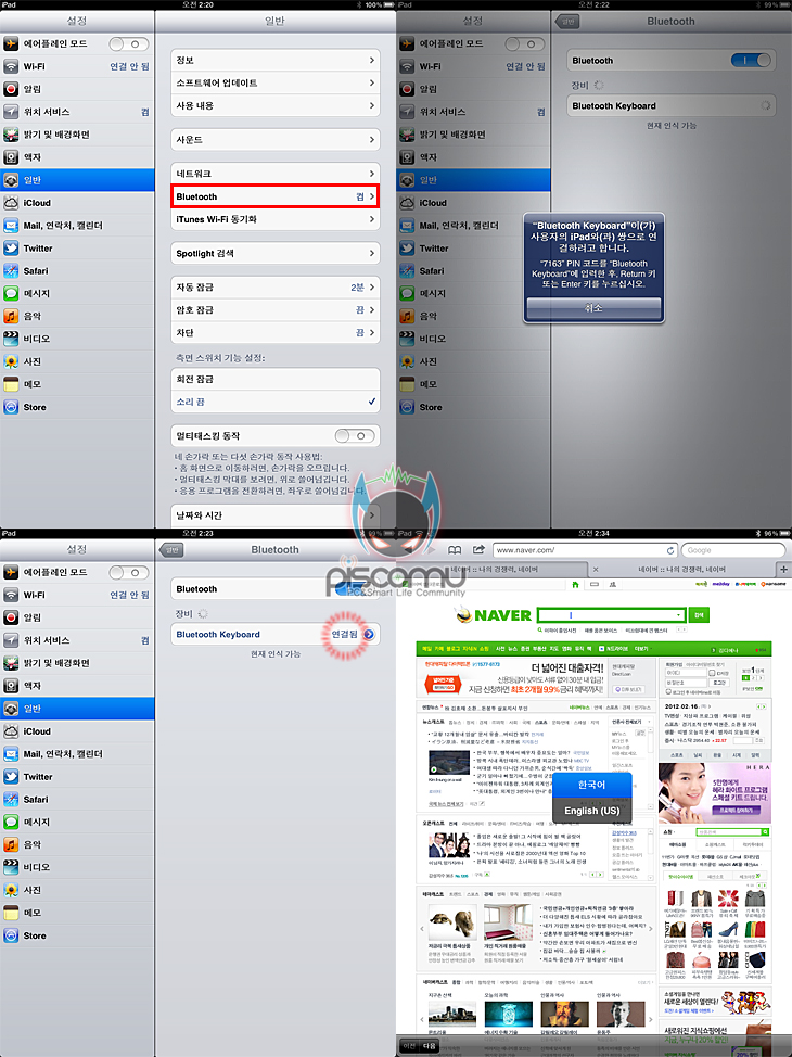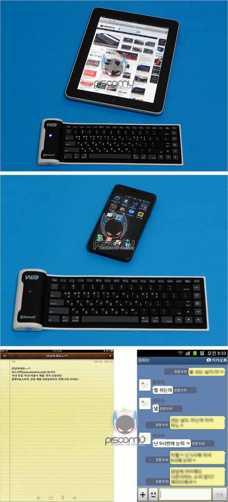 실제, W3 스마트 미니를 사용해 보았습니다. 기본적으로 블루투스 지원의 PC에서는 흔히 사용되는 키보드는 많고, W3 스마트 미니는 스마트폰/타블렛PC 컨셉이기 때문에 2가지 기기에서 사용을 해보았습니다. 사용에 앞서, 각 기기의 블루투스 설정을 해야하는데, 대표적인 타블렛PC 애플의 아이패드 경우 “설정-블루투스-연결코드입력” 단계로 설정을 하면 쉽게 W3 스마트 미니 블루투스 연결이 됩니다. 연결 후 한/영 전환은 “Command+스페이스 바”로 변경할 수 있겠습니다. 스마트 폰 경우, 삼성 갤럭시S 2를 예를 들어 블루투스 연결을 한다면, “환경설정-무선 및 네트워크-블루투스 설정-블루투스 활성화-연결코드 입력” 단계로 설정을 하면 어렵지 않게 연결이 됩니다. 연결 후 한/영 전환은 “Shift+스페이스 바”로 변결할 수 있습니다. 즉, O/S(운영체제)에 따라 한/영 전환이 다르겠습니다. 블루투스 연결 후 2기기에서 사용을 해 본 결과, 입력이나 작동방식에선 무난합니다. 즉, 오작동이 없습니다. 또한, 입력 값 역시도 바로 바로 인식을 하는 수준입니다. 다만, 일반적인 키보드보다 작기 때문에 앞서 말했듯이, 손에 익숙해지려면 다소 시간이 필요하겠고, 손이 큰 사람의 경우 어쩔 수 없이 사용함에 있어 다소 불편함이 있을 수 있겠습니다. 따라서, 남성보다는 여성들에게 좀 더 어울리는 제품이라고도 할 수 있겠습니다.