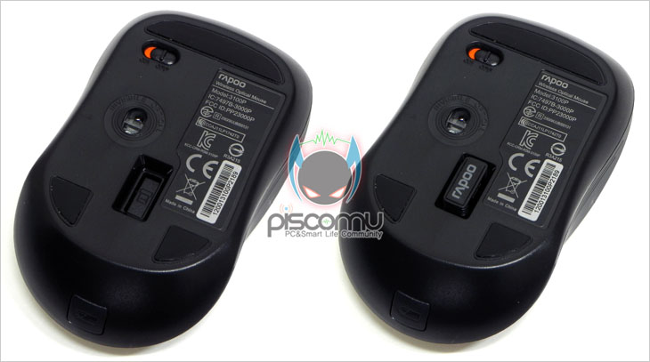 3100P는 국내에 3가지 색상 블루, 블랙, 화이트로 출시가 되었습니다. 마우스를 살펴보면, 좌우대칭형 형태로 상위 커버 표면에는 모델 색상마다 다양한 디자인처리를 했습니다. 그리고, 그립감 후부분에는 제조사 로고가 새겨져 있습니다. 앞부분에는 기본 좌우 버튼과 함께 가운데 휠-버튼이 자리잡고 있습니다. 휠-버튼은 정확한 스크롤을 위해 톱니 바퀴 모양으로 처리되었습니다. 휠-버튼 뒤에는 배러티 수명을 알려주는 램프가 배치되어 있습니다. 마우스를 측면에서 보면 함께 출시된 1090P와 3000P와 달리 마우스 뒷부분이 내림 디자인이 아닌 올림 디자인임을 확인할 수 있어, 차이점을 주고 있습니다. 이 마우스 뒷부분에는 배터리 교체를 위한 상위 커버 분리 버튼이 있는데, 버튼을 누르면 자동적으로 커버가 열립니다. 그리고, 커버를 분리하면 내부에 AA 건전지 2개가 소모되는 것을 확인할 수 있는데, 기본적으로 배터리를 지원해주고 있겠습니다. 커버 분리는 1090P, 3000P 3100P 세 모델 중 가장 쉬운 편입니다. 마우스 밑부분에는 3000P와 동일하게 좌측 상위에 커넥터 스위치, 그 아래 1000DPI 해상도 지원의 센서가 배치되어 있으며, 가운데 부분에는 USB 수신기 수납공간이 있겠습니다.