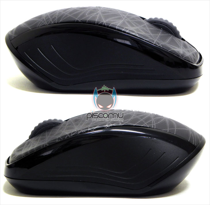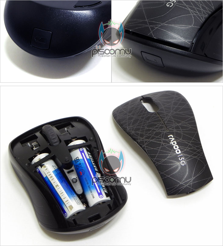 3100P는 국내에 3가지 색상 블루, 블랙, 화이트로 출시가 되었습니다. 마우스를 살펴보면, 좌우대칭형 형태로 상위 커버 표면에는 모델 색상마다 다양한 디자인처리를 했습니다. 그리고, 그립감 후부분에는 제조사 로고가 새겨져 있습니다. 앞부분에는 기본 좌우 버튼과 함께 가운데 휠-버튼이 자리잡고 있습니다. 휠-버튼은 정확한 스크롤을 위해 톱니 바퀴 모양으로 처리되었습니다. 휠-버튼 뒤에는 배러티 수명을 알려주는 램프가 배치되어 있습니다. 마우스를 측면에서 보면 함께 출시된 1090P와 3000P와 달리 마우스 뒷부분이 내림 디자인이 아닌 올림 디자인임을 확인할 수 있어, 차이점을 주고 있습니다. 이 마우스 뒷부분에는 배터리 교체를 위한 상위 커버 분리 버튼이 있는데, 버튼을 누르면 자동적으로 커버가 열립니다. 그리고, 커버를 분리하면 내부에 AA 건전지 2개가 소모되는 것을 확인할 수 있는데, 기본적으로 배터리를 지원해주고 있겠습니다. 커버 분리는 1090P, 3000P 3100P 세 모델 중 가장 쉬운 편입니다. 마우스 밑부분에는 3000P와 동일하게 좌측 상위에 커넥터 스위치, 그 아래 1000DPI 해상도 지원의 센서가 배치되어 있으며, 가운데 부분에는 USB 수신기 수납공간이 있겠습니다.