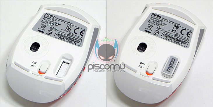 3300P는 블랙과 화이트 2가지 색상으로 출시가 되었으며, 색상에 따라 상위 커버에 디자인도 다르겠습니다. 마우스 형태는 좌우대칭형으로 왼손/오른손 양쪽 모두 가능하겠습니다. 3300P 크기는 함께 출시된 일반 마우스 크기의 모델과 비교해보면 마우스 사이즈가 전체적으로 작다라는 것을 쉽게 이해할 수 있겠습니다. 크기와 높이 모두 작습니다. 좌우버튼 가운데의 휠-버튼은 민무늬 형태로 처리가 되었습니다. 함께 출시된 모델처럼 톱니 바퀴 모양으로 처리가 되었으면 좀 더 좋지 않았을까 생각합니다. 마우스 측면은 약간 안으로 들어가는 형태로 표면에는 작은 홈 무늬들이 처리되어 있겠습니다. 마우스 밑면에는 앞뒤부분에 부드러운 마우스 움직임을 위해 테프론 피트가 부착되어 있으며, 왼쪽에는 센서가 오른쪽에는 휴대시 USB 수신기를 수납할 수 있는 공간이 지원되었습니다. 휴대시 분실을 방지해주겠습니다. 그리고, 가운데 아랫부분에는 커넥터 스위치가 자리잡고 있습니다. 커넥터 스위치 아래에는 배터리 교체를 위한 마우스 커버 분리 레버가 있는데, 이 레버는 오른쪽으로 밀면 쉽게 커버를 분리할 수 있습니다. 커버를 분리하면 마우스 내부에 AA건전지 1개가 소모되는 것을 확인할 수 있습니다. 그리고, 배터리는 기본적으로 제공이 됩니다.