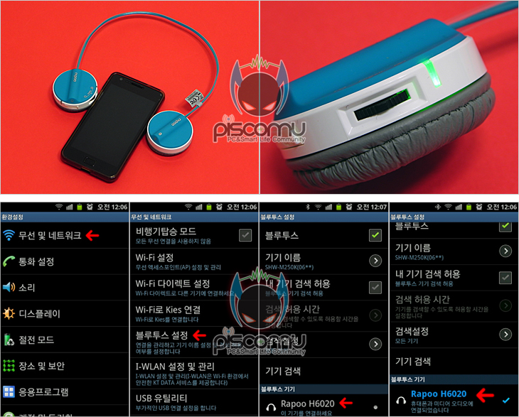 H6020을 직접 스마트 폰에 연결해 사용해보았습니다. 일단, 연결을 하기 위해서는 전원/볼륨조절 컨트롤 가운데를 눌러 전원을 켜는데, 누르고 있다보면 램프에 녹색빛이 자주 깜빡이면서 들어오겠습니다. 이 상태에서 스마트 폰 기기의 환경설정 메뉴를 통해 블루투스 장치를 검색 H6020이 발견되면 페어링 연결하면 블루투스 연결이 끝나겠습니다. 음악을 재생해, 사운드 음질을 들어봤는데, 잡음이나 고음에서 찢어지는 현상을 없고, 맑고 깨끗한 음질을 들려줬습니다. 또한, 재생 중에 전화가 오면 통화 연결을 하는 즉시 자동적으로 통화 송수신 역할을 자동적으로 알아서 해주고, 통화가 끝난 후에는 다시 자동적으로 음악을 재생 시켜줍니다. 또한, 볼륨 조절 역시 스마트 폰에서 볼륨 조절과 H6020의 볼륨조절이 합쳐지기 때문에 스마트 폰 최대 볼륨에서 더 높은 볼륨을 올려 들을 수 있겠습니다.