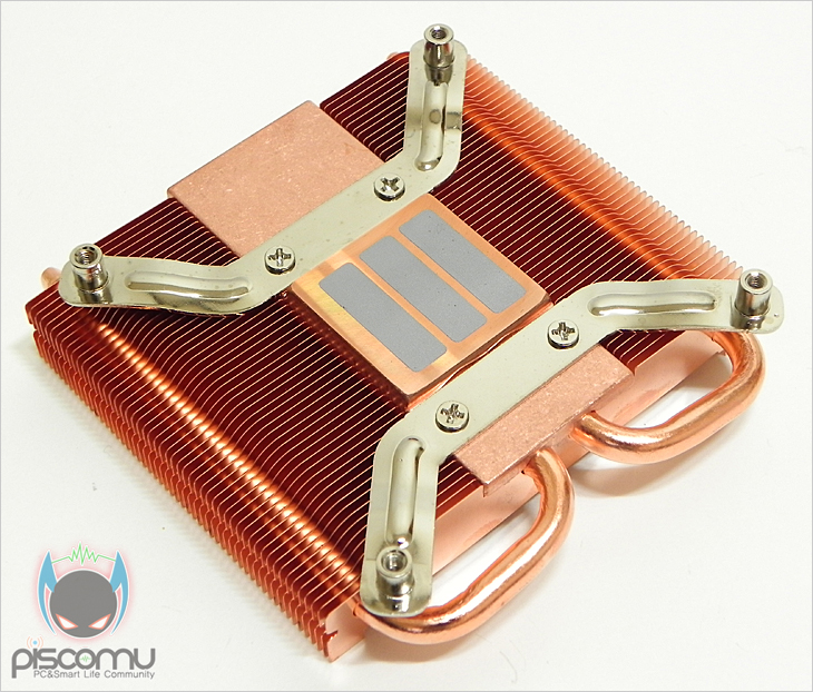 팬을 분리해 쿨러 자체를 좀 더 자세히 살펴보면, 방열핀과 히트파이프 모두 구리 재질이 사용되었으며, 도금 없이 그대로 적용을 했습니다. 방열핀은 총 53장이 적용 되었고, 핀 간의 간격은 약 1.5mm정도를 유지하고 있겠습니다. 히트파이프의 개수는 2개이며, 지름은 6mm가 됩니다. 쿨러 밑면을 보면, CPU와 맞닿는 베이스 부분에는 기본적으로 써멀컴파운드가 발라져 있겠습니다. 또한, 베이스 부분 역시 도금처리 역시 구리 그대로 적용을 해놨습니다. 그리고, 메인보드에 장착되기 위한 리텐션 플레이트도 쿨러에 기본 함께 장착이 되어있는 것을 확인할 수 있습니다. ITX30을 인텔 기본 쿨러와 높이 비교를 해보면, 2배 가까이 낮은 것을 확인할 수 있습니다. 최근 피스커뮤에서 살펴본, GELID의 ITX용 쿨러 모델과 높이가 비슷하겠습니다. 참고로, ITX30의 높이는 30mm가 되겠습니다.