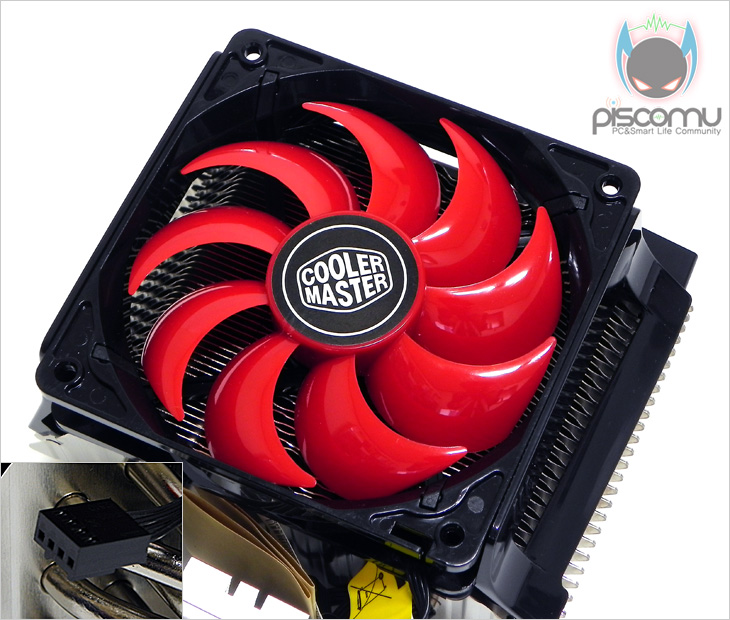 X6의 디자인을 살펴보도록 하겠습니다. 제품 개봉시 상태는 쿨러 측면과 상단 커버에 보호비닐이 부착되어 있습니다. 즉, 표면처리를 광택처리 했다라는 것을 알 수 있습니다. 색상은 블랙과 레드 조합으로 세련되면서 고급스러운 느낌을 함께 줍니다. 전면에 기본적으로 장착된 120mm 팬은 총 9개의 블레이드(날개)를 가진 팬으로 레드 색상과 회오리를 연상케하는 디자인으로 처리가 되었습니다. 팬 작동은 온도에 따라 자동 속도조절되는 PWM방식을 지원했습니다. 조금 아쉽다면, LED 팬으로 지원되었으면 좀 더 제품 퀄리티가 높지 않았을까 생각해봅니다.