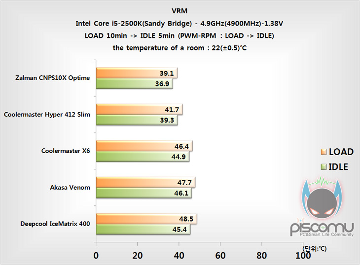 계속해서, 2차 오버클럭 상황에서의 전원부에 주는 냉각 영향을 확인해 보았습니다. 학인 결과, X6는 앞서 프로세서 성능 결과는 약간 다르게 중간 순위에 머무리는 것을 보여줬는데, 온도 역시 약간 높은 편으로 전원부에 대한 냉각 영향은 많이 주지 못하는 것으로 생각됩니다.