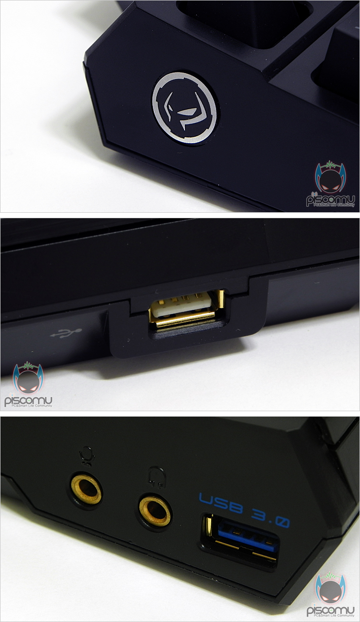 엔지니어링 샘플이기 때문에 바로, Aivia Osmium(오스뮴)의 디자인을 살펴보겠습니다. 전체 색상은 블랙(Black) 입니다. 기본적인 키 배열은 일반 키 배열과 큰 차이가 없으며, 한국에 출시되는 최종적인 키 배열은 좀 더 일반 키 배열과 흡사해 적극하기 편할 것 같습니다. 그리고, 전체 키 캡 표면 처리는 우레탄 코팅으로 처리가 되었습니다. 기본 키 배열 외 추가 지원 키 및 특징을 살펴보면, 왼쪽 제일 상위에는 매크로 키가 총 5개 지원됩니다. 그리고, 바로 오른쪽에는 LED와 볼륨 조절을 할 수 있게 마우스의 휠(wheel) 방식으로 처리를 지원을 해주고 있습니다. 또한, 게임 중 실수로 윈도우 키를 누르는 방지를 위해 윈도우 키 잠금 키(win lock)가 지원됩니다. 그리고, 바로 위에 좀 특이한 배치로 쉬프트(Shift) 키 바로 왼쪽에 “\” 키가 있는데, 한국 정식 출시되는 원래 위치인 back(←) 키 왼쪽에 배치되니 참고하시면 될 것 같습니다. Aivia Osmium(오스뮴)의 키 스위치는 체리사의 적축으로 출시됩니다. 적축은 흑축과 청축의 장점을 담은 것으로 흑축의 타이핑 시 작은 소음과 청축의 가벼운 키 압력을 가진 스위치로 현재 국내에서 가장 많이 선호하는 스위치라 국내 출시에 좋은 반응을 기대할 수 있겠습니다. 그리고, 스위치 바로 위에는 어두운 곳에서도 쉽게 타이핑을 할 수 있게 LED가 장착되어 있습니다. 키보드 주변 테두리 부분을 살펴보면, 좌측에는 기가바이트 게이밍(gaming) 브랜드 로고가 새겨져 있으며, 숫자 키 위치 전면에는 기본 USB 2.0(1.1) 포트가 1개, 우측에는 EAR/MIC 포트와 함께 세계 최초로 USB 3.0 포트 1개를 지원해주는 것을 확인할 수 있겠습니다. 또한, 포트 모두 신호손실 최소화를 위해 금도금 처리를 해놨습니다. 조금 아쉬운 점이라면, 로고가 LED 방식으로 처리되었으면 좀 더 눈으로 보는 제품의 퀄리티가 높아지지 않았을까 생각해 봅니다.