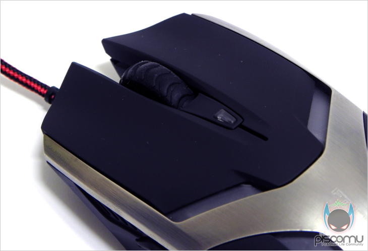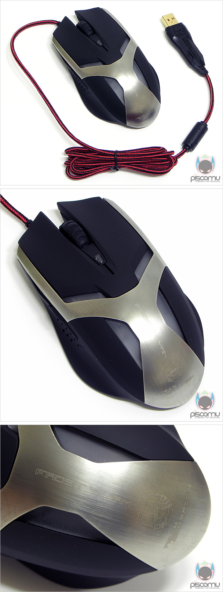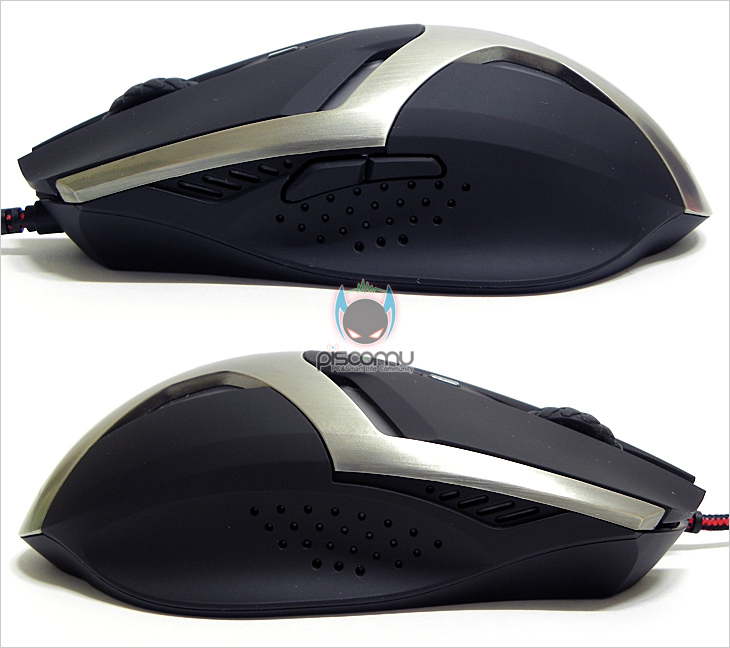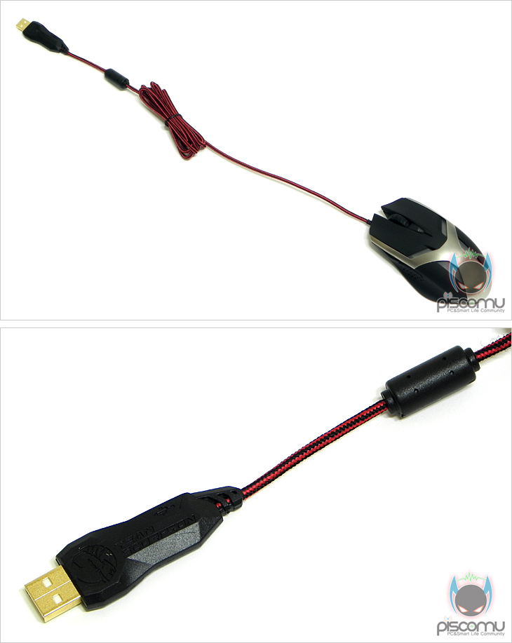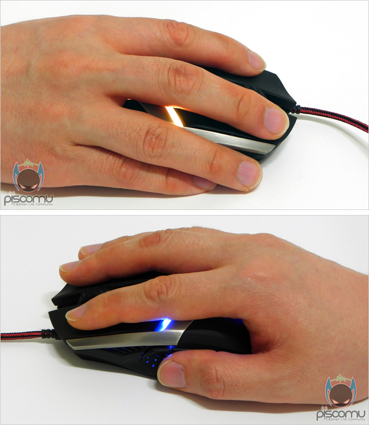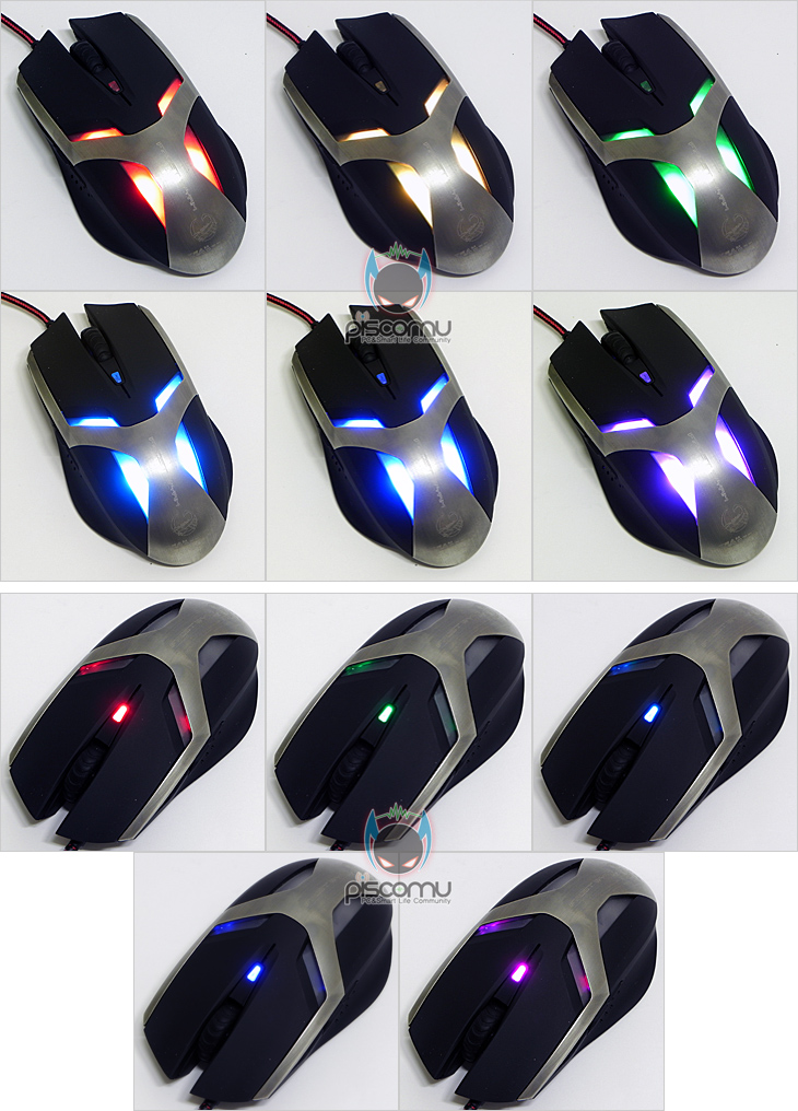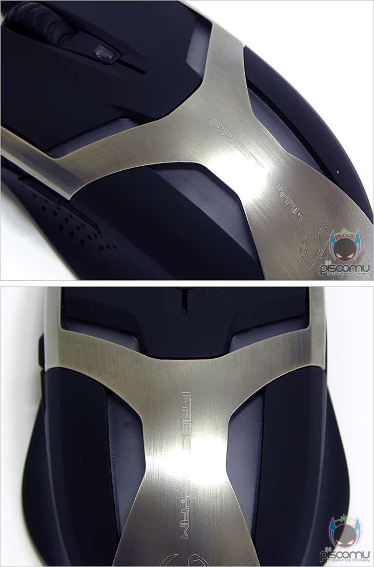 이제, 프로스트-웜(Frost Wyam)의 디자인을 살펴보도록 하겠습니다. 기본 색은 블랙(Black)이며 부분적으로 메탈 디자인이 들어가 있는데, 소재는 알루미늄이며 모델명과 제조사명이 각인 새겨져 있으며, 표면 처리를 아노다이징 해 헤어라인 효과도 있겠습니다. 마우스 디자인은 좌우 대칭형으로 오른손/왼손 모두 사용이 가능하겠습니다. 앞부분 좌우 버튼 부분은 우레탄 코팅 처리를 했으며, 가운데 휠 버튼은 고무 재질 사용으로 정확한 스크롤이 되도록 바퀴 모양으로 처리가 되어 있겠습니다. 휠 버튼 뒤에는 적용되는 DPI값을 변경하는 버튼과 동시에 램프 처리가 되어 있는데, 400/800/1200/1600/2000DPI마다 램프 빛이 레드/그린/블루/민트/핑크순으로 변경되겠습니다. 참고로 마우스 버튼에 사용된 스위치는 일본 옴론(Omron)사임을 제조사는 언급하고 있겠습니다. 마우스 가운데 부분에는 총 4개 구간에 LED 튜닝효과를 볼 수 있게 지원을 해주고 있습니다. 총 6가지 색상으로 변경이 가능하며, Off모드를 비롯해 가장 밝은 빛으로 바뀌는 Full-Lightened 모드, 빛이 순차적으로 밝아지는 Breathing 모드, 그리고 고정으로 빛을 설정할 수 있는 싱글 모드 총 가지 모드를 제공되는 프로그램을 통해 설정할 수 있겠습니다. 마우스 측면은 안티 슬립 처리와 에어홀 처리를 통해 땀 발생과 미끄러짐이 적게 되도록 했으며, 왼쪽에는 2개의 버튼이 배치되어 있습니다. 기본 기능은 브라우저 앞/뒤 가기지만, 제공되는 프로그램을 통해서 매크로 기능으로도 변경이 가능하겠습니다. 마우스 밑면을 살펴보면, 가운데 마우스 센서를 비롯해, 부드러운 움직임을 위해 외곽 부분에는 테프론 피트를 기본 부착 해놨습니다. 참고로 프로스트-웜(Frost Wyam)에 적용된 센서는 아바고(Avago)사의 ADNS-3050이 되겠습니다. 끝으로, 마우스 케이블은 총 1.8m의 긴 길이를 갖추고 있어 유선 거리에 대한 제한 부족함은 없겠으며, 케이블 손상방지를 위해 전체 슬리빙 처리를 했으며, 신호손실 최소화를 위해 노이즈 필터 적용과 포트부분을 금도금으로 처리했습니다.