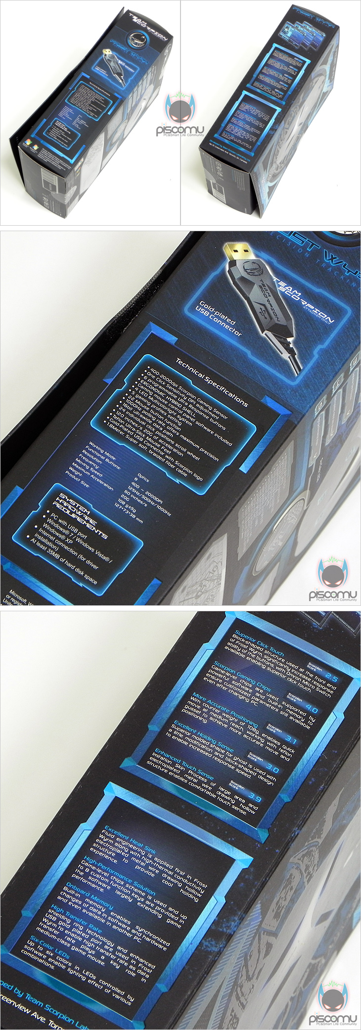 프로스트-웜(Frost Wyam) 제품 박스 전면에는 마우스 이미지가 삽입되어 있어 바로 디자인형태를 확인할 수 있으며, 모델명과 브랜명을 기입해놨습니다. 여기에 앞서 출시되었던 X-LUCA, G-LUCA와 마찬가지로 전면 덮개를 오픈해 실제 포장되어 있는 프로스트-웜(Frost Wyam)을 확인할 수 있습니다. 박스를 좀 더 살펴보면, 측면에는 금도금처리된 USB 포트를 언급으로 제품의 기본 스펙 정보와 지원 사양, 제품에 관한 주요 특징을 소개하고 있겠습니다. 박스 후면에는 좀 더 자세하게 제품을 소개하고 있는데, 한국어로 소개가 되어 있어 쉽게 소비자가 구입 전 제품의 특징을 파악할 수 있겠습니다. 대표적인 특징으론 400~2000DPI 지원, LED 지원, 매크로 기능 등을 언급하고 있습니다. 제품 포장은 마우스 크기에 맞춘 캡(CAP) 형식으로 포장으로 되어 있습니다. 마우스를 비롯한 구성품에는 케이블타이, 제품 설명서, 제품 스티커, 프로그램 CD가 제공됩니다. 제품 설명서에는 각 나라별 언어도 지원하고 있는데, 한국어 역시 포함이 되어 있으며, 품질 보증기간이 1년으로 되어있지만, 실제 한국에서 제품 보증 기간은 3년임을 참고하면 되겠습니다.