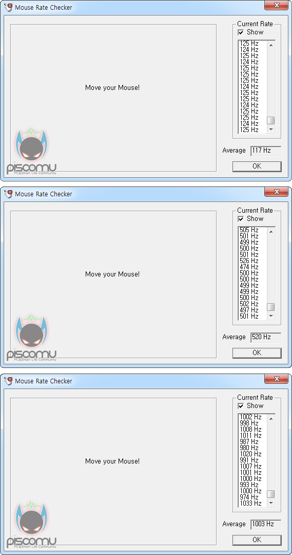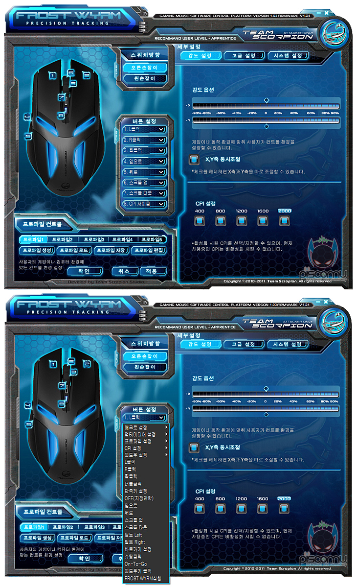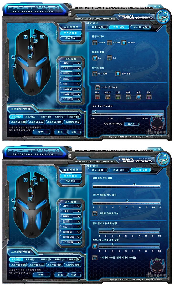 실제, 프로스트-웜(Frost Wyam)을 사용해 보았습니다. 앞서 언급했듯이 프로스트-웜(Frost Wyam)은 LED 지원으로 튜닝효과를 볼 수 있습니다. 레드/오렌지/그린/민트/블루/핑크 순으로 자동 변환이 되는데, 조금 아쉬운 점은 색 순서에 있어서 민트(청록)와 블루의 차이가 크지 않아서 구분은 되지만, 다른 색 변화에 비하면 조금 변화감이 떨어져서 색 순서가 조금 아쉽습니다. 그리고, DPI값에 따른 LED 램프 변화 역시 확인을 할 수 있겠습니다. 그리고, 그립감은 사용자 손 크기에 따라 틀리겠지만, 대체로 편안한 편입니다. 게이밍 마우스이기 때문에 전체를 감싸기 보다는 손가락의 버튼 위치나 손바닥과 맞닿는 마우스 뒷부분의 착용감이 중요한데, 버튼을 누르는 위치도 적절하며 뒷부분 역시 손바닥에 감싸지는 느낌을 잘 받겠습니다. 그리고, 뒤에서 확인하겠지만, 제공되는 프로그램을 통해 전송제어 속도(Polling Rate)를 125/500/1000Hz으로 변경이 가능한데, 변경된 값으로 측정해 본 결과, 모두 정상적으로 잘 작동되는 것을 확인할 수 있겠습니다. 참고로 USB포트 방식에선 최대 1000Hz까지 설정이 가능합니다. 프로스트-웜(Frost Wyam)으로 직접 게임을 해보았습니다. 각 게임별로 적게는 2시간 많게는 5시간정도 사용을 해 본 결과, DPI설정에 따른 포인트 움직임을 만족스러운 편입니다. 단, 게임에서 할 때는 최소 1200DPI부터 적용하는 좀 편하다라는 느낌을 받고, 일반, 작업이나 웹에선 800 DPI부터 사용하는 것이 편하다라는 느낌을 받겠습니다. 그리고, 땀 발생은 하지만, 적게 발생하는 편이여서 장시간에도 최적이다 할 수 있겠습니다. 끝으로, 프로스트-웜(Frost Wyam)에 제공되는 프로그램을 살펴보겠습니다. 매크로 설정과 마우스 부가 기능 설정을 할 수 있는 프로그램은, 좌측에 마우스의 각 버튼에 대한 매크로 기능 설정 및 변경이 가능하며, 프로파일도 5개 지원 해주고 있어 저장/불러오기를 할 수 있겠습니다. 그리고, 오른쪽에는 첫 번째 설정으로 마우스의 감도와 각 DPI값의 활성/비활성을 설정할 수 있겠습니다. 그리고, 고급 설정을 통해서는 전송제어 속도(Polling Rate)를 비롯해 앞서 언급한 LED 라이트 효과에 대한 설정을 할 수 있겠습니다. 끝으로, 시스템 설정을 통해서는 클릭과 포인트, 휠 스크롤 속도에 대한 설정을 할 수 있겠습니다. 한국어를 지원해주고 있어 초보자도 쉽게 프로그램을 사용할 수 있겠습니다.