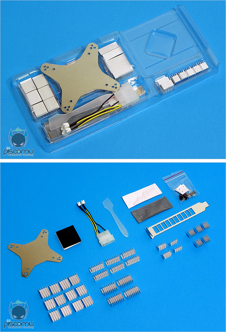 쿨러를 제외한 제공 구성품에는 백플레이트, EVA폼, 4핀 팬 전원 어댑터, 써멀을 쉽게 바르게 해주는 주걱, 써멀 컴파운드, 리무브 써멀 패드, 각 종 스크류, PCI 브라켓, 그리고 각 종 히트싱크를 제공해주고 있겠습니다. 구성품 역시 백플레이트 추가 외에는 크게 다르지 않겠습니다.