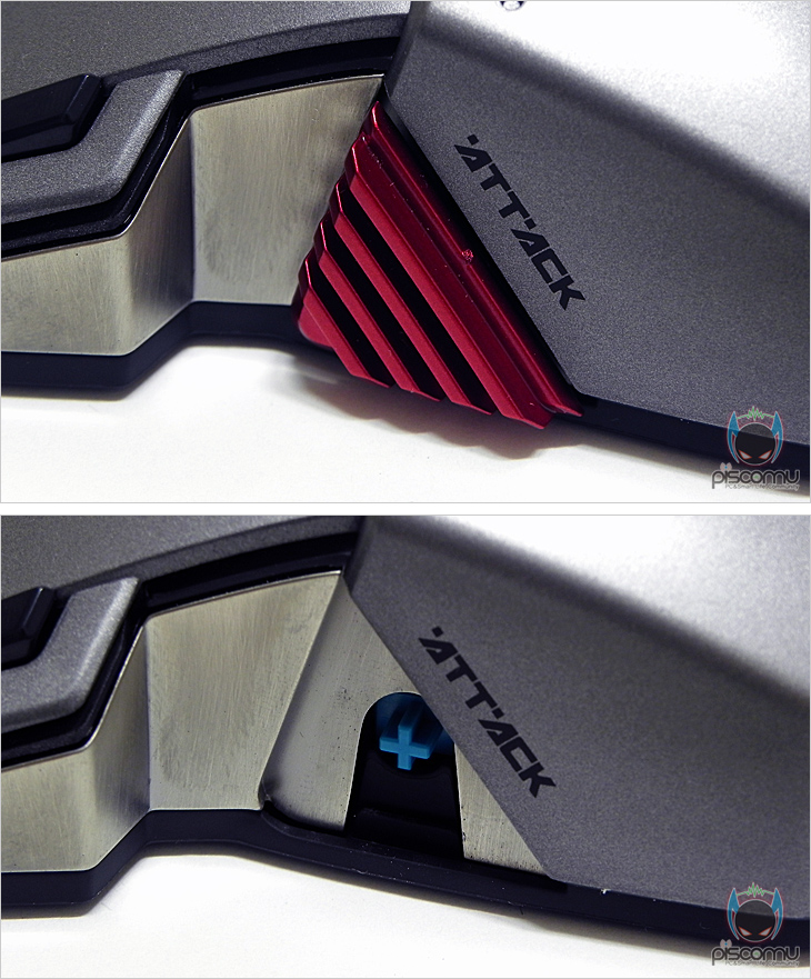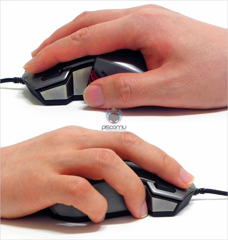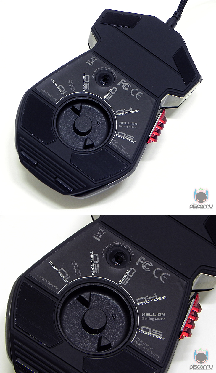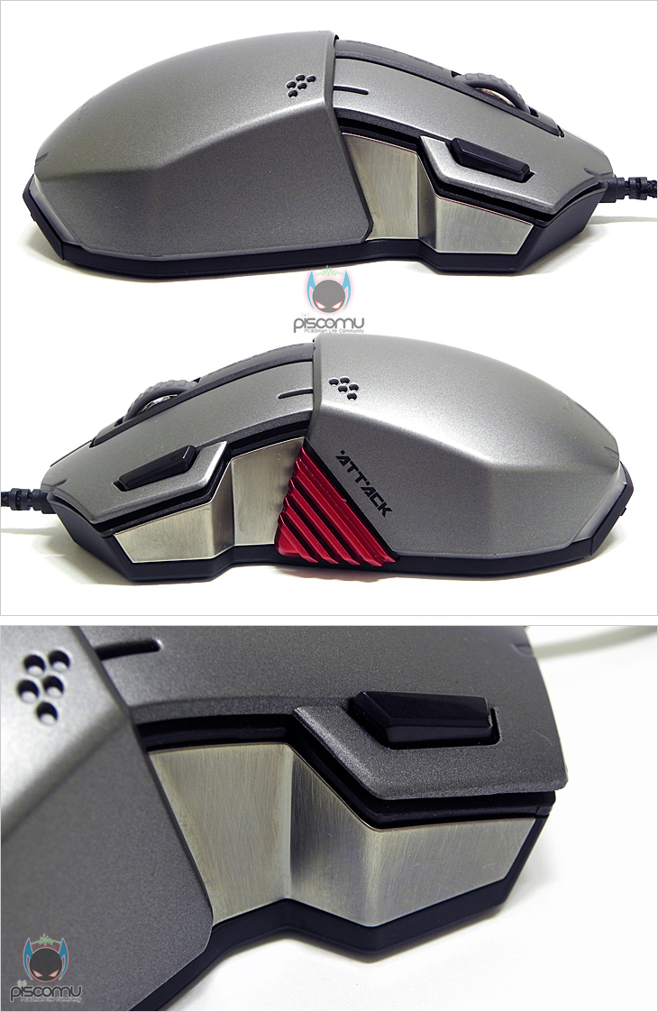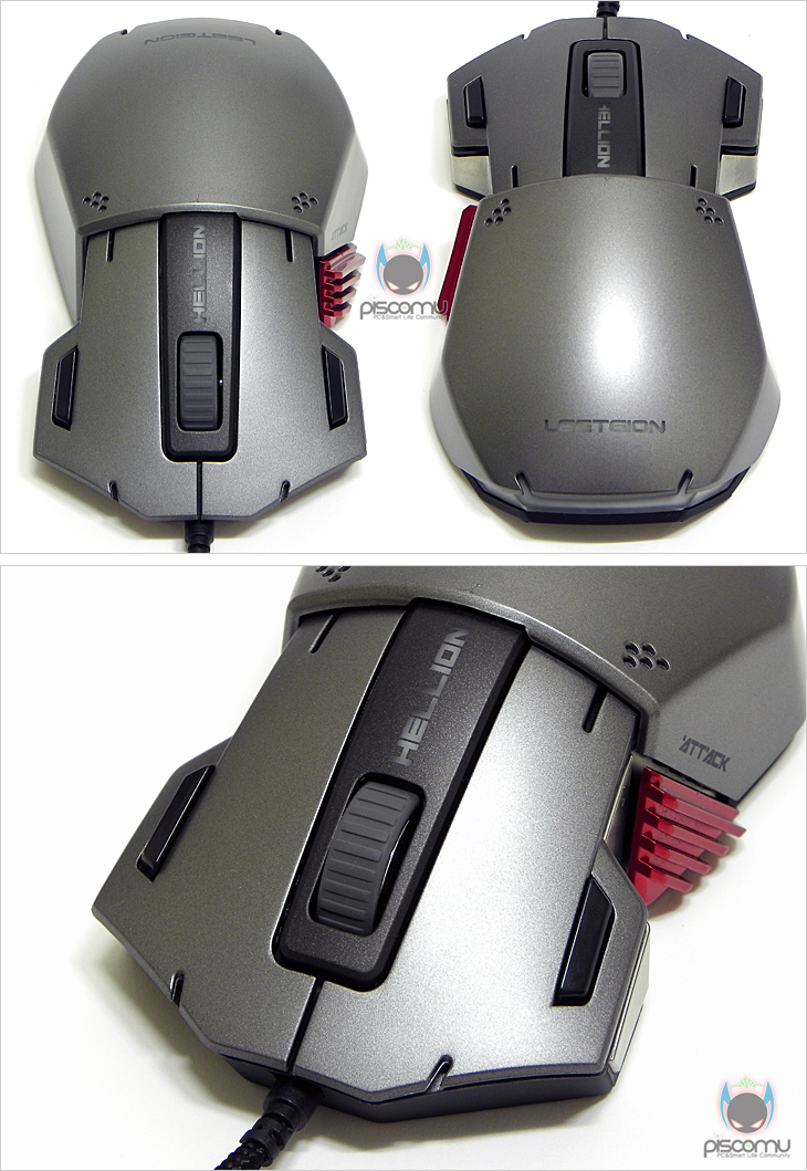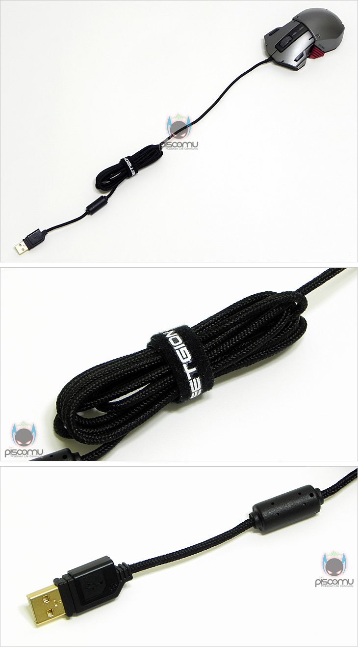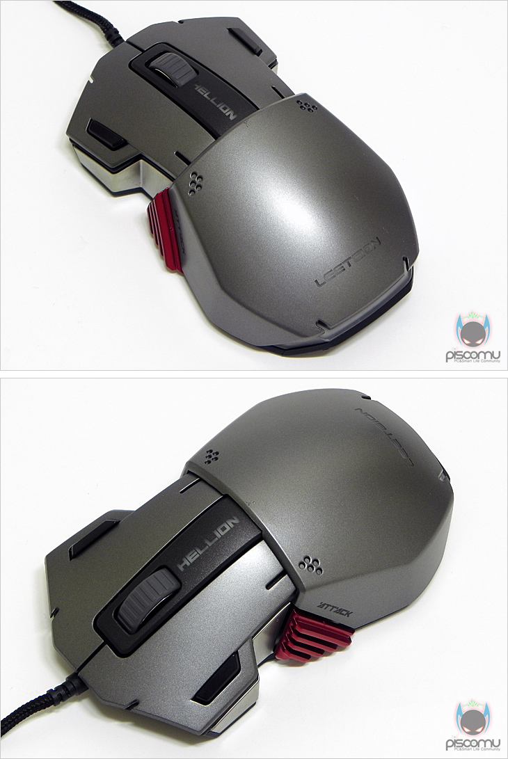 마우스 외형을 살펴보면, 전체적인 디자인이 메커니즘(Mechanism)으로 상당히 인상적인 느낌을 줍니다. 색상 역시 일반적인 블랙(Black)이 아닌 회색(Gray) 위주로 처리가 되어 있습니다. 마우스 형태는 좌우 대칭형으로 왼손/오른손 모두 사용이 가능하겠습니다. 마우스 앞부분에는 기본적인 좌우버튼이 배치되어 있고, 가운데 휠(Wheel) 버튼은 고무 재질 사용과 톱니 모양으로 정확한 스크롤이 되도록 했습니다. 휠 버튼 바로 뒤에는 모델명이 새겨져 있는데 LED 지원으로 작동시 튜닝효과를 볼 수 있겠습니다. 그리고, 좌우 버튼 외곽쪽에는 추가 버튼이 배치되어 있는데, 흔히 게이밍 마우스 왼쪽 측면에 있는 웹(Web) 앞/뒤 버튼이 Hellion(헬리온)에선 좌우 버튼 외곽에 배치되었습니다. 참고로 좌우 버튼 스위치에는 일본 옴론(OMRON)사 스위치가 적용되었습니다. 마우스 뒷부분 역시 브랜드명 표기와 함께 LED지원을 통해 튜닝효과를 볼 수 있도록 했으며, DPI값을 변경할 수 있는 2개의 버튼이 배치되어 있습니다. 참고로 DPI값 범위는 100~5000DPI까지입니다. 마우스 측면을 보면 중앙 앞부분에 각진 홈 라인을 처리했는데, 이 부분은 뒤에서 확인하겠지만, 마우스 그립시 좀 더 편안한 착용감을 주기 위함이 되겠습니다. 특히, 오른손 잡이인 경우 약손가락이 편안하겠습니다. 그리고, 좌측에는 현재 기계식 키보드에서 적용되는 체리사 청축 스위치를 적용했는데, 이 버튼은 핫키(Hoy Key) 같은 기능으로 사용자가 버튼 기능을 지정해 사용할 수 있습니다. 이렇게 마우스에 스위치를 적용한 이유는 게임시 기본 마우스 버튼보다 좀 더 빠르고 정교한 인식을 주기 위함으로 볼 수 있겠습니다. 이번엔 마우스 밑면을 살펴보는데, 밑면 표면 처리는 모두 우레탄 코팅처리를 했으며, 전후 위치에는 부드러운 움직임을 위해 기본 테프론 피트가 부착되어 있습니다. 그리고, 중앙 왼쪽부분에는 레이저 센서 배치로 마우스 센서제조사로 유명한 AVAGO사의 ADNS-9500 센서가 적용되었습니다. 그 바로 아래에는 레이스 스위치라 불리우는 흔히 말하는 프로파일 기능의 스위치가 지원되고 있습니다. 원형 다이얼 방식으로 총 4개의 프로파일 지정이 가능하겠습니다. 끝으로, 케이블을 살펴보면, 케이블 전체 길이는 1.8m로 유선 길이로썬 부족함이 없겠습니다. 또한, 케이블 전체는 패브릭 재질을 사용해 슬리빙 처리를 했으며, 신호손실 최소화를 위해 노이즈 필터와 USB 포트는 금도금으로 처리를 했습니다.