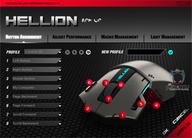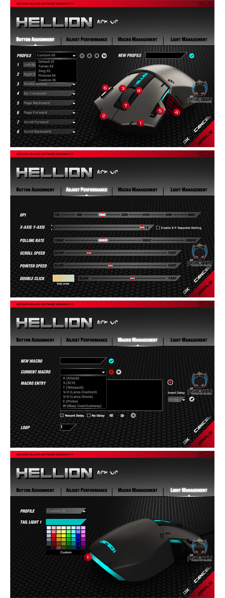 앞서 살펴 본 것처럼, Hellion(헬리온)는 다양한 기능을 지원하고 있습니다. 따라서, 당연히 전용 프로그램도 지원을 해주고 있는데, 홈페이지를 통해 프로그램을 다운로드 받을 수 있겠습니다. 아쉽지만, 한국어 지원은 없습니다. 하지만, 프로그램 사용은 비교적 간단한 편이기 때문에 어렵지 않게 사용할 수 있겠습니다. 먼저, 첫 번째 메뉴는 버튼 관련 설정 메뉴로 총 8개의 버튼 기능을 사용자가 직접 설정할 수 있습니다. 그리고, 앞서 언급한 레이저 스위치 즉 기본 설정을 제외한 나머지 4개의 프로파일로 지정할 수 있겠습니다. 두 번째 메뉴는 마우스의 기본 기능 설정 부분으로 DPI값 변경부터, 독립적인 X/Y축 해상도 설정, 전송제어 속도(Polling Rate) 변경, 스크롤 속도, 포인트 속도, 더블 클릭 반응까지 사용자가 원하는 상황으로 설정할 수 있겠습니다. 셋 번째는 매크로 설정으로 앞서 본 좌측 청축 스위치 버튼을 설정하는 것으로 기본설정은 블리자드의 스타크래프트 게임으로 맞춰져 있습니다. 마지막 메뉴는 LED 라이트닝 설정 부분으로 총 1670만 컬러 지원을 해 이 중 원하는 색상을 4가지 지정할 수 있겠습니다. 즉, 앞서 맨 처음 메뉴인 프로파일 설정을 LED 라이트닝을 통해 구분할 수 있겠습니다.