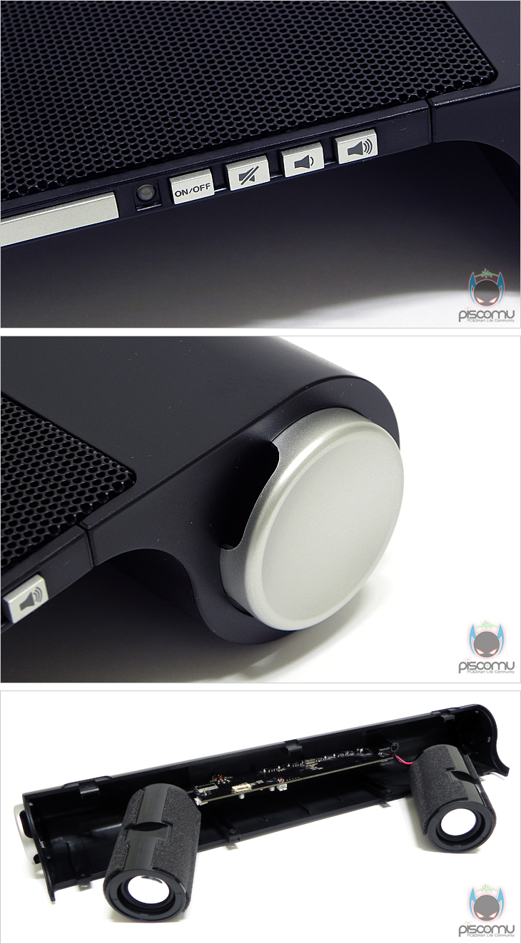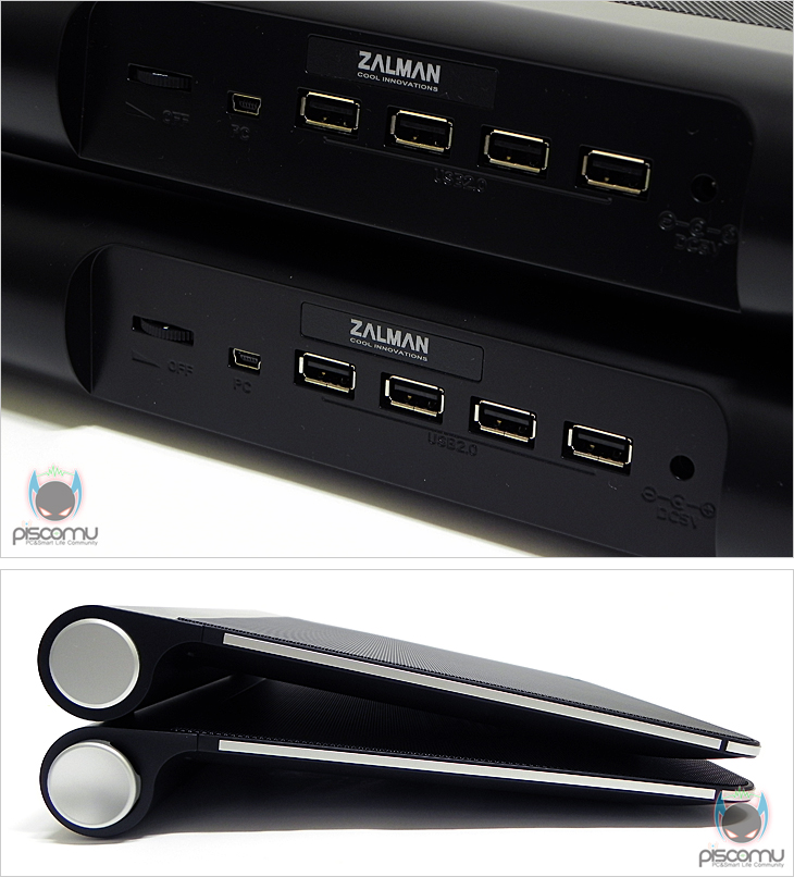 이제, ZM-NC3500/Plus의 외형을 살펴보겠습니다. 두 제품 모두 기본적인 디자인과 생김새는 동일합니다. 노트북 밑면과 맞닿는 쿨러 상위는 일부 앞부분은 제외한 전체 메쉬(타공망) 처리를 해놨으며, 내부에는 대형 220mm 팬이 장착되어 있겠습니다. 또한, 오른쪽 하단에는 제조사 로고가 부착되어 있습니다. 쿨러 전면 역시 두 모델 모두 동일한 구성으로 포트 지원을 갖추고 있습니다. USB 전원 포트를 제외한 일반 USB 포트 총 4개 지원과 왼쪽에는 팬 속도를 조절할 수 있는 팬 컨트롤러가 배치되어 있겠습니다. 또한, 별도의 5V 전원 단자로 지원 합니다. 그리고, 쿨러 측면 역시 두 모델 동일한 디자인으로 별도의 높낮이 지원 없이 앞부분이 원형 디자인으로 약 10°가량 올라가 경사형태를 이루고 있겠습니다. 쿨러 밑면 역시 두 모델 동일한 형태로 외부 공기 유입을 위해 중앙 에어홀 처리와 함께 미끄럼 방지를 위한 전후 각 모서리 부근에 고무패드를 기본 부착 해놨습니다. 이제, ZM-NC3500/Plus 두 모델의 차이점을 확인해 보겠습니다. 기본 모델(ZM-NC3500)경우 우측에 터보 부스터 기능이 있는데, 이 기능은 앞서 말했듯이 전면에 있는 팬 컨트롤러 외에 추가로 팬 속도를 더 끌어올려 작동시켜주는 기능이 되겠습니다. 왼쪽부터 터보 부스터 램프, On/Off 버튼, 터보 부스터 버튼 순으로 배치가 되어 있습니다. 이와 달리 Plus 모델은 우측에 스피커 지원으로 인한 볼륨 조절 버튼과 음소거 버튼, 그리고 On/Off 버튼, 램프가 배치되어 있습니다. 또한, 앞부분 측면 원형 부분에는 홀처리가 되어 있는데, 내부에서 보면 양쪽에 2개의 스피커가 배치된 것을 확인할 수 있겠습니다. 즉, 2채널 스피커를 갖춘 것입니다.