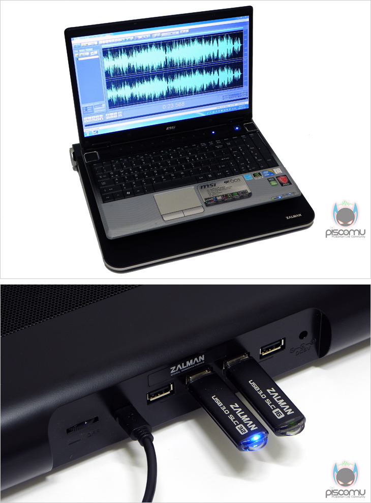 실제, ZM-NC3500/Plus를 사용해 보았습니다. 최대 17인치까지 지원하는 이번 모델에 15.6인치 노트북을 올려놓고, 먼저, 터보 부스터 기능이 있는 기본 모델을 PCMark를 실행해 터보 부스터 사용시와 기본 팬 속도 최대/최저일 때의 노트북 내부 주요 칩셋 온도를 확인해 보았습니다. 확인 결과, 큰 차이는 아니지만, 팬 속도가 높아짐에 따라 1~2°가량의 온도차이가 있음을 확인할 수 있겠습니다. 그리고, 두 모델 모두 동일 팬이기 때문에 기본 팬의 최대/최저 팬 소음과 기본 모델의 터보 부스터 시 팬소음을 측정해 본 결과, 역시 팬 속도에 따라 소음이 반비례하는 결과를 보여줬습니다. 하지만, 전체적으로 팬 소음 모두 30~40db(A) 영역이라 소음은 준수한 편이라 할 수 있겠습니다. 끝으로, Plus 모델 경우 탑재된 스피커를 노트북 자쳬 한 계의 사운드 출력을 해결해주기에는 충분한 걸을 느낄 수 있어서 게임이나 영상 감상 시 사용으로 좋겠습니다. 그리고, 두 모델 모두 4개의 USB 포트를 지원하고 있어 노트북의 부족한 USB 포트를 느끼는 사용자에겐 아주 유용한 지원이 되겠습니다.