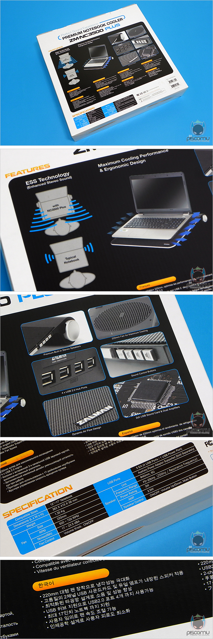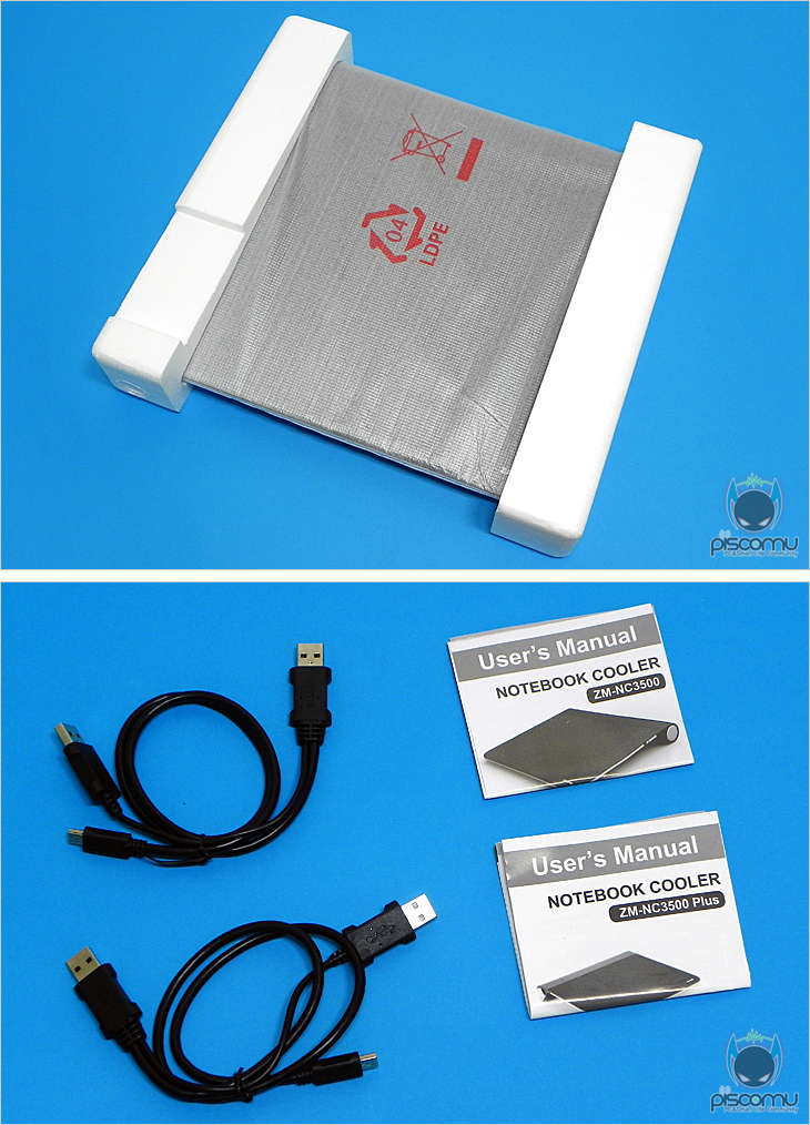 ZM-NC3500/Plus의 제품 박스를 살펴보면, 일단, 기본 모델(ZM-NC3500)은 제품의 가장 큰 특징인 터보 팬 기능 지원을 강조하고 있습니다. 여기에 4개의 USB 포트 지원과 220mm 팬 지원, 최대 17인치 노트북 지원도 확인할 수 있는데, 이는 기본 지원으로 Plus모델에도 동일하게 적용됩니다. Plus모델(ZM-NC3500 Plus) 경우 역시 제품의 가장 큰 특징이 스피커 지원을 강조하고 있습니다. 스테레오 사운드 지원의 스피커 지원외에 기본 지원은 바로 앞서 말했듯이 기본 모델과 동일합니다. 또한, 두 제품 모두 동일하게 제품 운반이 편하도록 손잡이 지원을 해주고 있으며, 박스 측면에도 제품 모델명을 표기해놔 제품을 쉽게 구분할 수 있도록 해주겠습니다. 좀 더 박스를 살펴보면, 이번에 박스 후면을 통해 기본 모델은 앞서 언급한 터보 부스터 기능과 더불어 좀 더 제품에 관한 특징을 자세히 설명해주고 있습니다. 터보 부스터 기능은 기본적으로 지원하는 팬 컨트롤러로 인한 최대 팬 속도외에 추가로 더 팬 속도를 올려 작동시킬 수 있는 기능을 말하겠습니다. 팬 속도는 620~720RPM 범위를 가졌으며, 터보시에는 800RPM으로 작동되는 것을 스펙 정보를 통해 확인할 수 있겠습니다. Plus 모델 역시 박스 후면에는 제품의 특징인 스피커 지원에 대해 좀 더 자세히 언급을 하고 있으며, 두 모델의 동일 지원 부분도 함께 언급하고 있습니다. 스피커는 2채널 구성으로 40유닛을 적용했음을 스펙 정보를 통해 확인할 수 있겠습니다. 제품 포장은 두 제품 모두 동일하게 제품 크기에 맞춘 스티로폼 방식으로 외부 충격에 의한 파손 방지를 해주겠습니다. 쿨러외에 기본 제공 구성품은 설명서와 USB 전원 케이블 역시 동일하겠습니다.
