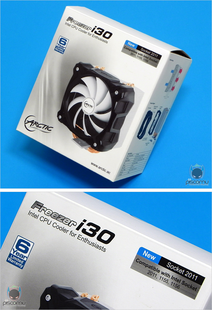 Freezer i30은 시작해서 말했듯 인텔 전용 모델입니다. LGA1156소켓부터 LGA2011까지의 프로세서를 지원하면서, Arctic의 긴 제품 보증기간을 이번 모델에도 적용 6년 보장을 받을 수 있습니다. 이 밖에 제품 박스를 통해서는 쿨러의 풍향 방향을 비롯 구조와 기본 스펙 정보를 확인할 수 있는데, 특히, 쿨러 높이가 161mm라는 점에서 그동안 Freezer 시리즈 중 가장 높은 제품이며, 히트파이프 역시 지름 8mm 적용이 눈에 띕니다. 또한, 제품에 관한 주요 특징을 각 나라별 언어로도 소개하고 있는데, 아쉽게 한국어는 포함되어 있지 않습니다. 박스 후면에는 좀 더 자세하게 제품의 특징과 자사 자체의 테스트 성능을 공개하고 있어 소비자가 구입 전 제품의 정보를 충분히 습득할 수 있게 해주고 있겠습니다.