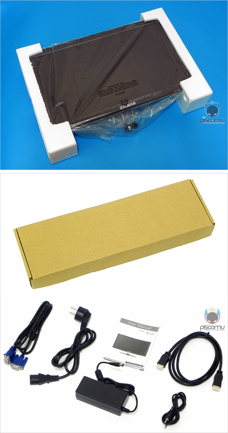 제품 포장은 기본적으로 모니터 포장에 적용되는 스티로폼 방식으로 외부 충격에 의한 파손 방지를 해주겠습니다. 구성품은 별도의 박스에 포장 되어 있는데, D-SUB(VGA) 케이블, 전원 연결케이블 및 어댑터, 설명서, HDMI 케이블, 오디오 케이블을 기본 제공해주겠습니다. 제품 초기상태는 모니터 베젤과 받침대 표면처러를 광택처리 해놔서 보호비닐이 부착되어 있습니다. 모니터와 받침대 연결은 흔히 모니터 제품에서 지원하는 받침대 홈에 먼저 끼운 후 핸드스크류로 고정하는 방식으로 초보자도 쉽게 연결할 수 있겠습니다.