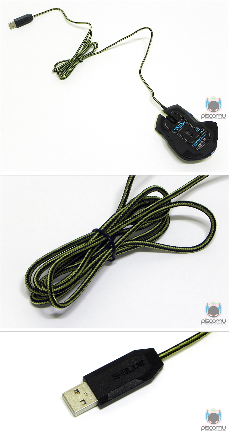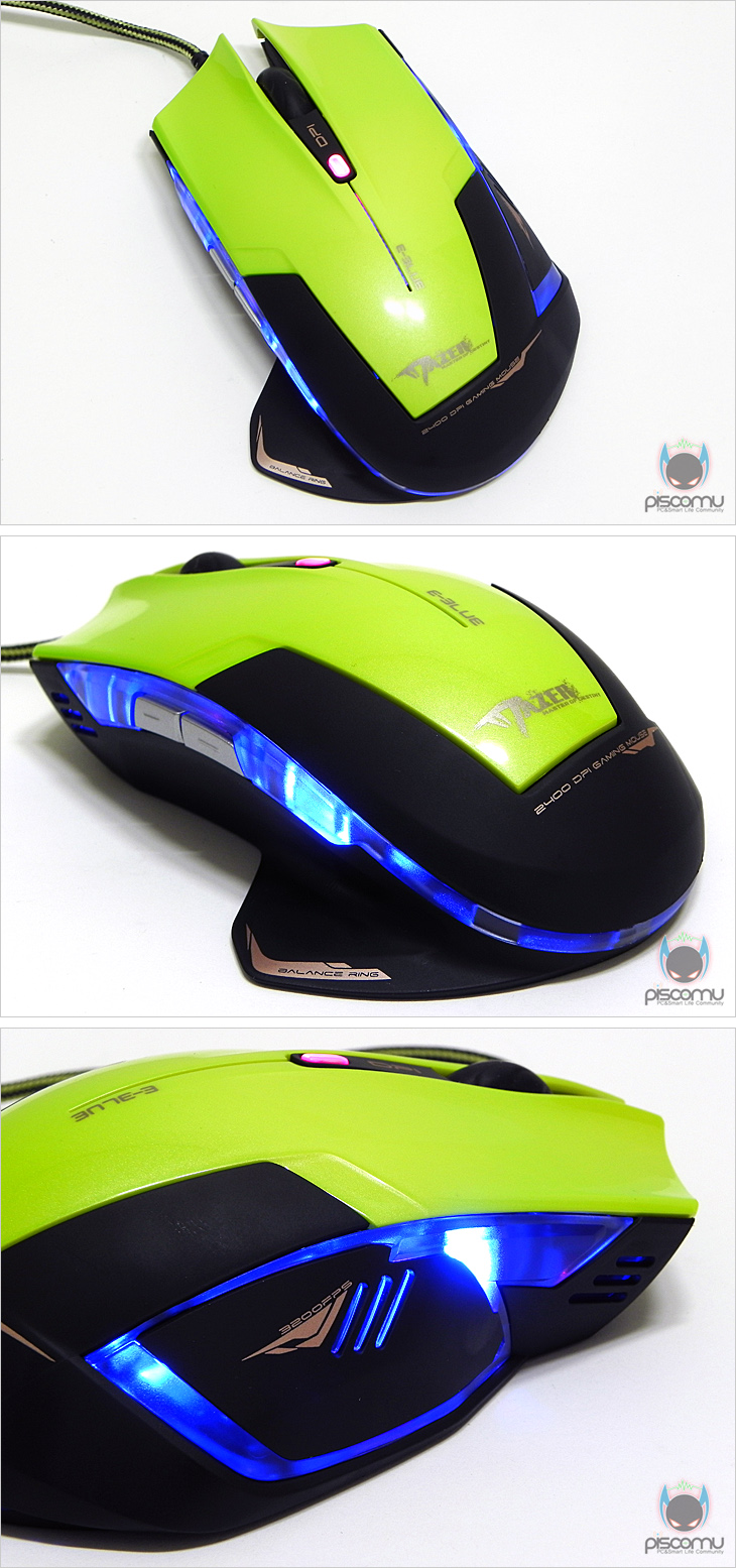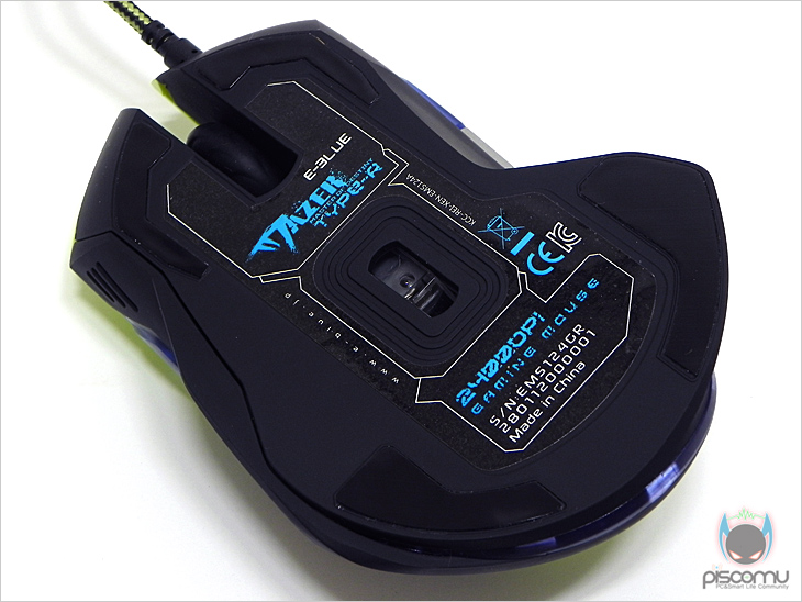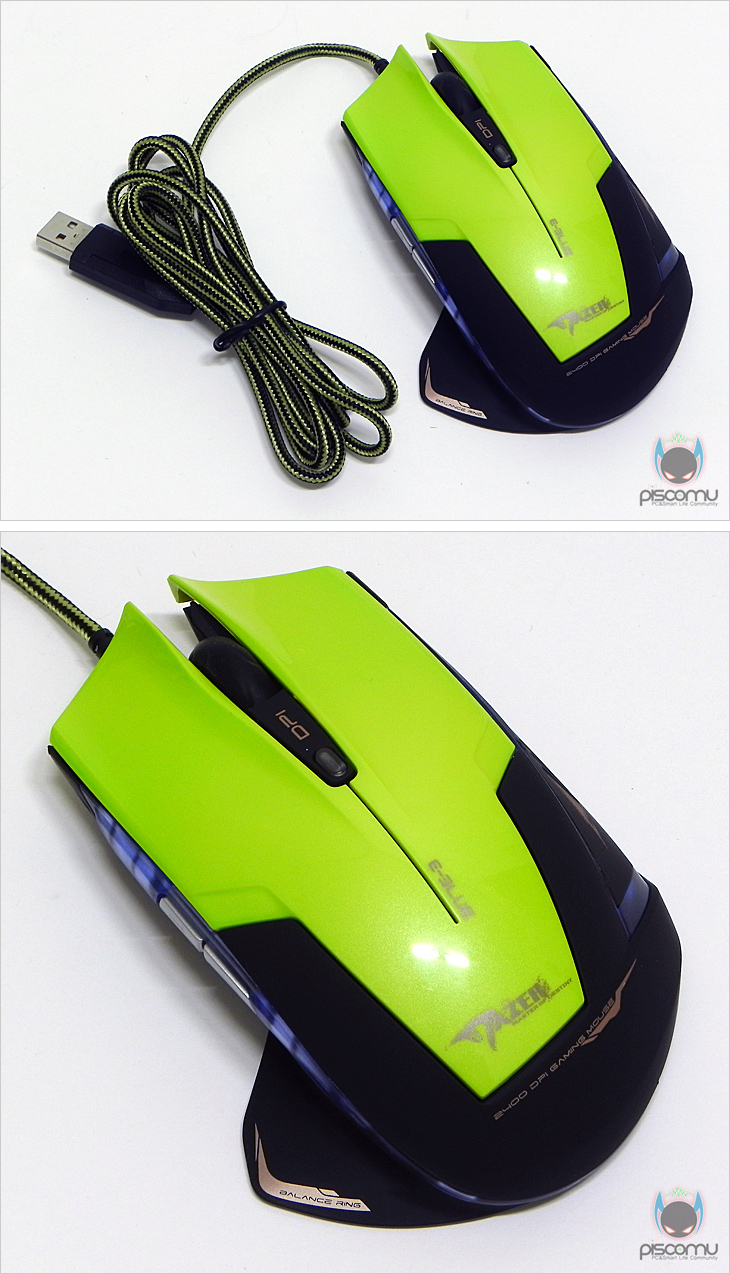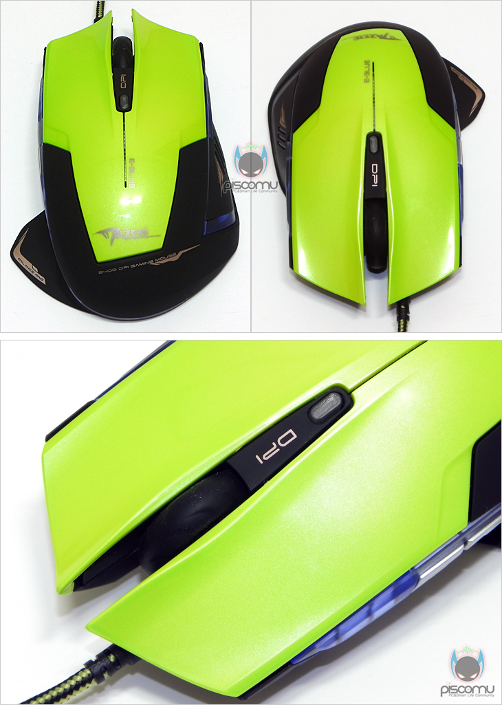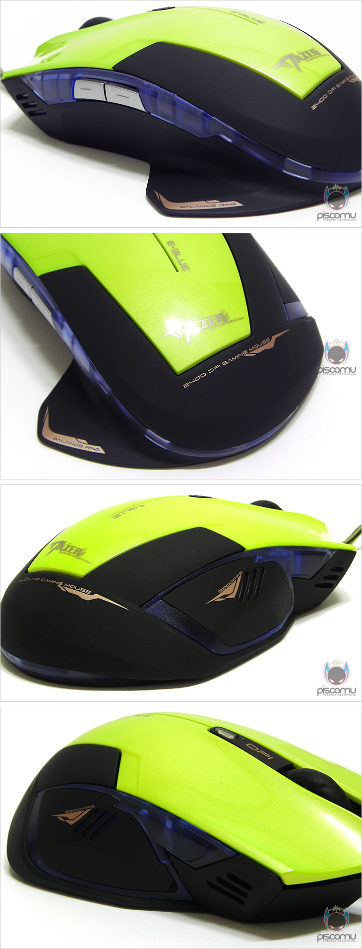 MAZER TYPE-R 외형을 살펴보겠습니다. 전체적인 색상은 유광 처리된 상위 커버 그린부분과 그 외 측면 후면 밑면부분 블랙색상으로 이루어져 있는데, 상위 커버 색상에 따라 블랙/그린과 전체 화이트 색상 총 3가지 모델로 출시가 되었습니다. 좀 더 외형을 살펴보면, 가장 큰 특징을 측면에서 확인할 수 있는데, 우측에는 마우스 제품에선 드물게 오른손 잡이에서 엄지손가락을 편하게 해주는 받침대 역할의 날개 같은 디자인을 확인할 수 있으며 좌측 역시 새끼손가락이 편하도록 볼륨 형태로 처리가 되어 있겠습니다. 즉, 오른손 잡이 최적의 그립감을 주도록 디자인 설계를 했는데, 제조사를 이를 Aircraft Wing이라 명하고 있겠습니다. 그리고, 여기에 블랙부분은 모두 러버코팅(무광)으로 처리해 좀 더 그립감을 높였습니다. 그리고, 우측에는 웹 페이지 앞/뒤 이동 기능의 버튼을 배치해놓은 것도 확인할 수 있겠습니다. 이런 측면 디자인은 마우스 전체적으로 봤을 때 좀 더 확실히 오른손 잡이 전용 마우스임을 알 수 있습니다. 그리고 기본 좌우 버튼과 가운데 위치한 휠 버튼은 정확한 스크롤을 위해 접지력이 있는 고무재질을 적용했으며, 휠 버튼 위에는 DPI값 변경 버튼으로 600/1200/1800/2400DPI로 4단계 조절이 가능하며 버튼에 램프처리를 함께해 실시간으로 변경을 확인할 수 있겠습니다. 마우스 밑면에는 부드러운 움직임을 위해 앞뒤 위치에 테프론 피트를 기본 부착했으며, 가운데는 광 센서가 위치해 있겠습니다. 케이블 부분은 총 1.8m 길이로 유선 제품으로써 충분한 길이를 가졌으며, 케이블 전체 패브릭 처리는 해당 제품의 색상과 맞추어서 처리가 되었습니다. 연결 인터페이스는 USB 방식이 되겠습니다. 이번엔 MAZER TYPE-R의 내부를 살펴보도록 하겠습니다. 내부를 보면, 상위 커버 내부에는 무게 추를 적용해 마우스의 무게를 적당히 느끼게 해주도록 했으며, PCB기판 각 모서리 부근에는 각 LED가 배치 총 4개의 LED가 배치되었으며, 광 센서에는 앞서 언급한 Avago사의 칩으로 ADNS-5090칩이 적용, 버튼 스위치에는 Kailh사 스위치가 적용되었습니다.