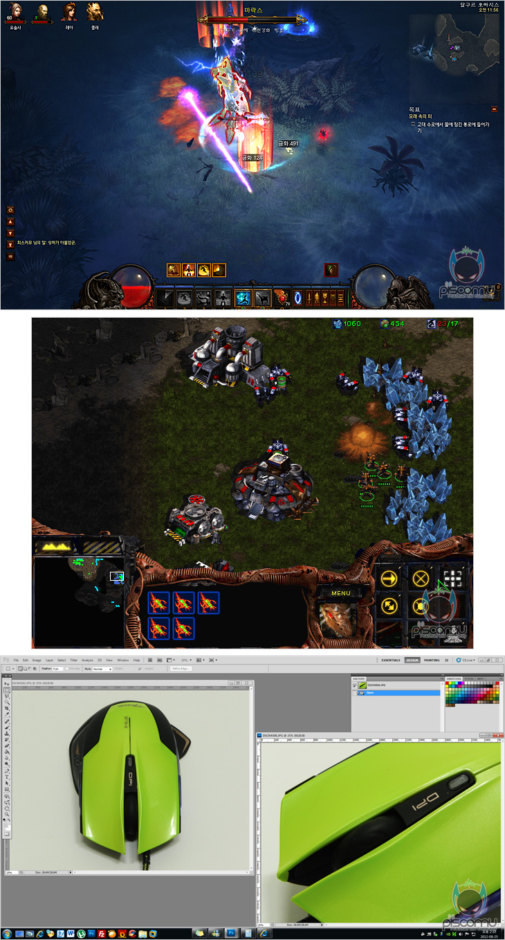 직접, MAZER TYPE-R을 사용해 보았습니다. 먼저 마우스 연결을 통해서는 테두리 부분으로 블루 LED가 들어와 튜닝효과를 바로 볼 수 있는데, 출시되는 3가지 모델 모두 동일한 LED 색상이 되겠습니다. 그리고, DPI 버튼은 각 DPI 값이 변경될 때 마다 LED 램프 형태로 바뀌는데 600DPI는 Off상태, 1200DPI는 레드, 1800DPI는 블루, 2400DPI는 핑크순으로 바뀌겠습니다. 특히, Off상태에선 주변 기본 LED 때문에 마치 LED가 들어온 것처럼 보이는 효과가 있습니다, 조금 아쉬운 점은 레드와 핑크 색 구분이 좀 더 명확했으면 하는 부분이 있겠습니다. 그립감은 오른손에 최적화된 디자인 효과를 볼 수 있는데, 앞서 본 엄지손가락 받침대(날개) 역할과 새끼 손가락의 위치가 마우스를 잡을 시 편안한 느낌을 줍니다. 다만, 엄지손가락 받침대경우 사용자에 따라 바로 편할 수도 있고, 다소 생소할 수도 있겠습니다. 그리고, 마우스 길이가 좀 있고, 높이가 약간 낮은 편이기 때문에 전체적으로 마우스를 감싸 잡는 느낌보다는 올려놓는 느낌이 되겠습니다. 그래서, 버튼 입력 역시 손가락에 무리가 가지 않게 가벼운 편입니다. 끝으로, 게임과 작업상에서 장시간 사용을 해보았습니다. 앞서 말했듯이 그립감이 마우스를 감싸는 느낌은 적기 때문에 마우스 움직임 넓고 빠른 이동을 필요로하는 FSP 장르보다는 버튼 클릭 횟수가 많은 RPG장르 게임에 좀 더 적합하겠습니다. 그리고, 일반 편집 작업에서도 사용하기에 적합하겠습니다. 각 DPI값에 따른 차이 느낌은 모두 있지만, 600과 1200에서 차이가 가장 느껴지겠습니다.