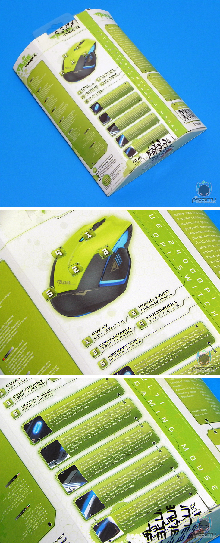 MAZER TYPE-R는 4단계의 DPI설정 지원과 광(Optical) 마우스 제품으로 센서는 Avago사의 칩이 적용된 제품임을 제품 박스 전면에서 바로 확인할 수 있습니다. 그리고, 다른 마우스 제품들과 마찬가지로 오픈식 팩키지 형태로 내부에 캡(CAP) 방식으로 포장된 제품을 확인할 수 있습니다. 이 밖에도 박스 후면을 통해서는 제품 부위별 특징을 자세히 언급하고 있는데, 앞서 언급한 4단계 DPI 설정 외에 피아노 페인트(유광) 처리, 최적화 그립감, 추가 버튼 지원, 항공기 날개(Aircraft Wing) 디자인을 언급하겠습니다. 그리고, 이런 특징을 각 나라별 언어로도 소개하고 있는데, 아쉽게 한국어는 포함되어 있지 않습니다. 그래도, 제품의 기본 스펙 정보까지 담고 있어 구입 전 충분히 제품에 대한 정보는 얻을 수 있겠습니다.