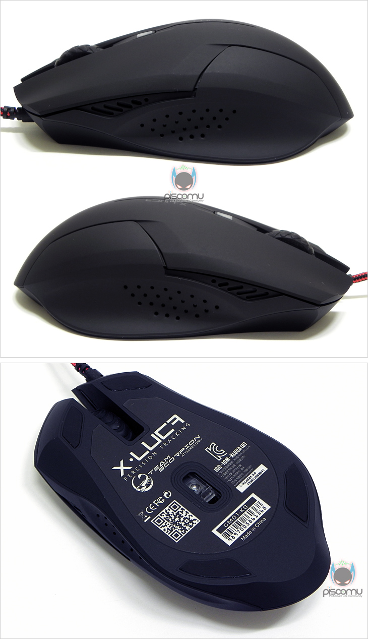 X-LUCA 스페셜에디션을 살펴보면, 가장 먼저 기존 모델과 큰 차이점은 상위 커버입니다. 기존 상위 커버는 광택처리로 되었지만, X-LUCA 스페셜에디션 경우 상위 커버까지 러버코팅 무광택처리를 해, 마우스 본체 전체가 러버코팅이 되겠습니다. 광택처리가 아니라는 점에 아쉬울 수 있지만, PC방 입장을 생각하면, 많은 사람들이 마우스를 만지는 곳이기 때문에 수시로 마우스 관리 해주기가 힘들다라는 점을 고려하면 코팅 변경을 당연한 것으로 생각할 수 있겠습니다. 그 외 전체적인 마우스 디자인은 기존 모델과 동일한 형태로 좌우대칭으로 왼손, 오른손 모두 사용이 가능하겠습니다. 그리고 상위 좌우 가운데 홈 라인 역시 작동시 LED 효과를 볼 수 있게 처리를 해놨습니다. 버튼은 좌우 기본 버튼과 가운데 훨 버튼이 지원되는데, 훨 버튼 경우 우레탄 재질을 적용해 스크롤 시 접지력을 높였습니다. 휠 버튼 뒤에는 DPI값을 변경하는 스위치 버튼으로 600/1200/1800/2400DPI 총 4단계로 변경이 가능합니다. 마우스 측면 역시 기존 모델과 동일하게 기존 지원되는 블루 LED 효과를 볼 수 있도록 패턴방식으로 홈 처리를 해놨습니다. 마우스 밑면은 최적의 슬라이딩과 브레이킹을 할 수 있도록 테프론 피트를 기본 부착 해놨습니다. 케이블은 전체 1.8m를 갖추어 유선 마우스로썬 충분한 길이이며, 기존 모델이 단순 피복처리인 반면, 이번 모델은 깔끔하게 패브릭 슬링빙 처리를 해놨습니다. 그리고, 신호손실 최소화를 위해 노이즈 필터 적용과 USB 포트는 금도금으로 처리를 해놨습니다. X-LUCA 스페셜에디션 내부를 살펴보면, 마우스 뒷부분에 내부 무게 추를 지원했으며, LED는 PCB기판 모서리 부근에 각 배치 총 4개가 지원되었습니다. 또한, 버튼 스위치는 옴론사의 스위치가 적용되었으며, 센서는 Avago사의 ADNS-5050 옵티컬(광) 센서가 적용되었습니다.