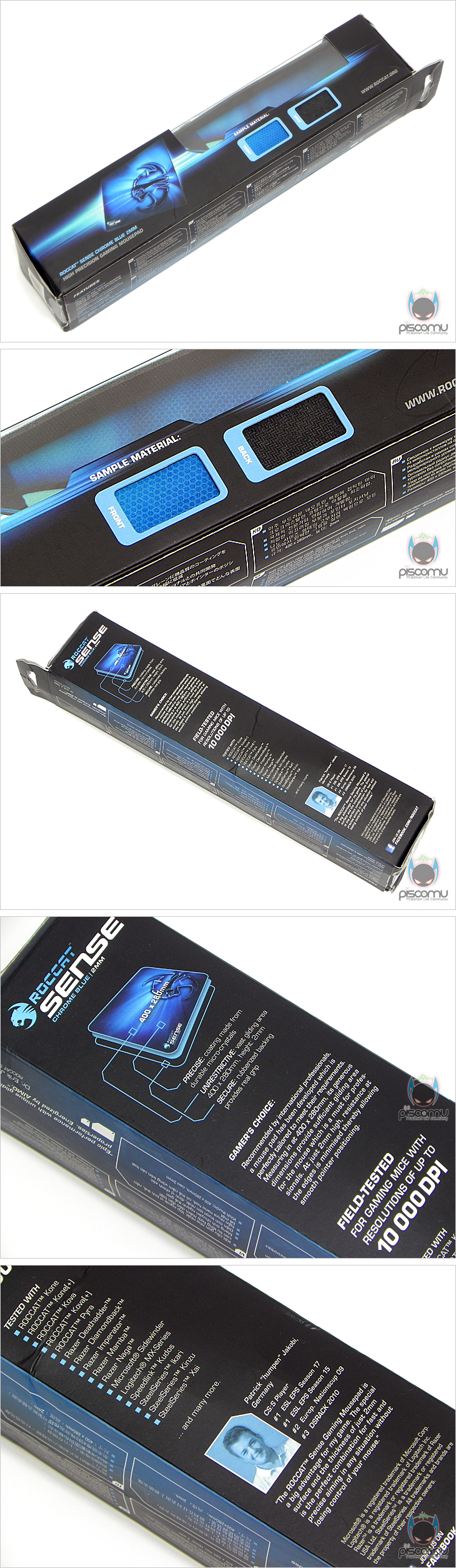 크롬 블루는 앞서 먼저 출시된 센스 시리즈의 Glacier(글레이셔), Adrenaline(아드레날린) 그 다음 세 번째 제품이 되겠습니다. 제품 팩키지를 살펴보면, 기존 센스 시리즈의 크기나 부드러운 패브릭 적용은 그대로 이어지며, 두께가 조금 두꺼워졌다라는 것을 언급해주고 있겠습니다. 또한, 유명 게이밍 브랜드답게 많은 마우스 제품군들로 테스트했음도 강조하고 있습니다. 또한, 박스 츠면에는 해당 제품에 적용된 패드의 전후면 재질 샘플을 부착해 구입 전 소비자가 촉감으로 느껴볼 수 있게 해주고 있겠습니다. 그리고, 제품의 크기, 패드 표면 코팅 기술, 테스트에 사용된 마우스 리스트, 전문 프로게이머 참여 등도 소개하고 있겠습니다. ROCCAT의 모든 제품은 출시 전 전세계 프로게이머를 직접 참여시켜 테스트를 거치는 과정을 하는데 이번 제품 역시 그렇게 진행되었음을 알 수 있겠습니다. 끝으로, 박스 후면에는 각 나라별 언어로 제품에 특징을 소개하고 있는데, 한국어 역시 기본 포함이 되어있습니다. 이는 한국 e-스포츠를 주요 시장으로 생각하고 있기 때문이라 해석할 수 있겠습니다.