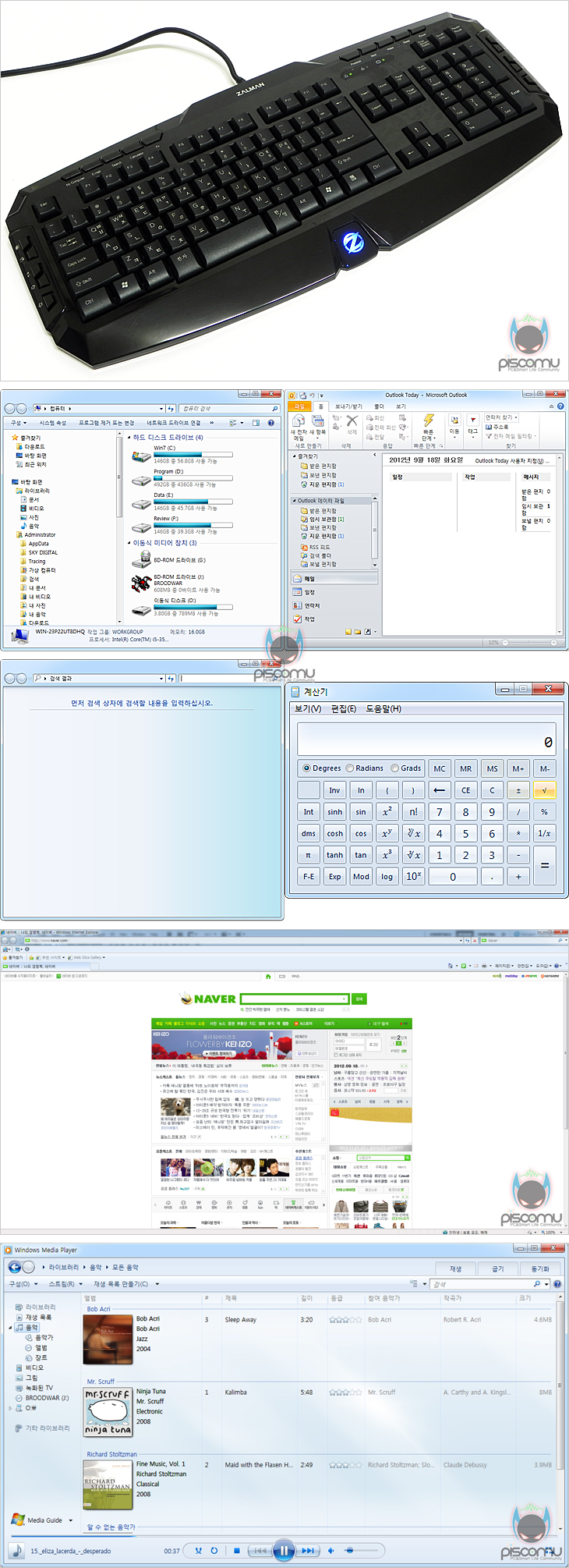 직접, ZM-K300M을 사용해 보았습니다. 별도의 드라이버 설치 없이 USB 포트에 연결하면 바로 사용할 수 있으며, 연결과 동시에 엠블럼에 블루 LED 효과를 볼 수 있겠습니다. 그리고, 멀티미디어 핫 키 중 프로그램 실행들은 바로 키를 입력할 시 실행되는 것을 확인할 수 있는데, E-mail은 아웃룩, 음악 재생은 윈도우 미디어 플레이어가 실행되겠습니다. 키보드 위주의 게임을 해본 결과, 키 입력은 즉각 보이는 편으로 만족스러웠습니다. 다만, 전체적으로 키 압력이 일반적인 멤브레인 키 압력보다 약간 묵중한 느낌이 나며, 멀티미디어 핫 키 중 볼륨 조절은 프로그램 상관없이 게임상에서도 바로 적용할 수 있겠습니다. 그리고, 베젤과 일체형으로 디자인된 팜레스트는 앞선 ZM-K350M보다 손목까지 잘 받쳐줘 타이핑이 편하겠습니다.
