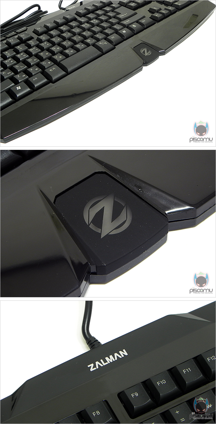 ZM-K300M을 살펴보면, 색상은 전체 블랙을 가졌으며, 기본 키들의 배열 형태는 현재 한글 자판 키보드 제품의 기본 배열과 동일한 형태를 가지고 있어 사용함에 있어 익숙하겠습니다. 조금 차이라면, 스페이스-바 길이가 좀 짧은 편이라는 점을 들 수 있겠습니다. 그리고, 이번 제품의 특징인 멀티미디어 핫 키를 총 20개 지원하는데, 먼저 전면 최상위 위치 왼쪽에는 내컴퓨터, E-mail, 검색, 달력, Fn 키가 배치되었으며, 오른쪽에는 이전, 앞으로, Wake(대기모드 해제), Sleep(대기모드), PC전원 키가 배치되어 있겠습니다. 그리고, 키보드 양쪽에도 나머지 10개의 키가 각각 배치되어 있는데, 왼쪽에는 인터넷 홈버튼, 즐겨찾기, 새로고침, 앞페이지, 뒷페이지로 웹브라우저 관련 키가 배치되었으며, 오른쪽에는 음악프로그램 실행, 재생/일시정지, 볼륨 조절, 음소거의 미디어 재생관련 키가 배치되어 있겠습니다. 키보드 외곽 베젤 부분 하단은 손목을 받쳐주는 팜레스트 디자인을 갖추고 있는데, 팜레스트 가운데는 엠블럼가 새겨져 키보드 사용시 LED 램프 효과를 볼 수 있으며, 로고 주변은 유광처리 된 외곽 베젤과 달리 무광으로 처리가 되어 있겠습니다. 그리고, 키보드 앞부분 중앙에는 제조사 로고가 새겨져 있겠습니다. 키 입력방식으로 앞선 모델들과 마찬가지로 멤브레인 방식을 가졌으며, 키 캡 자판 인쇄를 레이저 각인으로 오랜 사용에도 잘 지원지지 않겠습니다. 또한, 키 수명 역시 1천만회를 보장해준다고 언급을 해주고 있으며, 앞서 구성품에서 본 키 분리도구 키 메이트를 제공해주고 있어 키보드 청소시 키캡을 쉽게 분리할 수 있겠습니다. 또한, 제공되는 블루 키캡으로 게임시 자주 사용되는 W, A, S, D와 방향키를 시각적으로 빠른 위치 인식을 시킬 수 있겠습니다. 키보드 밑면을 살펴보면, 중앙 부분에 특유의 패턴 디자인과 함께 밑부분에는 미끄럼 방지를 위한 고무 패드가 기본 부착되어 있는데, 조금 아쉬운 점은 앞부분에 없다라는 점을 들 수 있겠습니다. 그리고, 받침대에는 한 단계 올릴 수 있는 높낮이 조절로 지원을 해주고 있겠습니다. 기본 높이는 낮은 편이지만, 높낮이는 사용했을 시에는 약 10°가량 높아지겠습니다. 끝으로, 유선 케이블 길이는 총 1.55m로 충분한 길이를 가지고 있겠습니다. 연결 인터페이스는 USB 방식입니다.