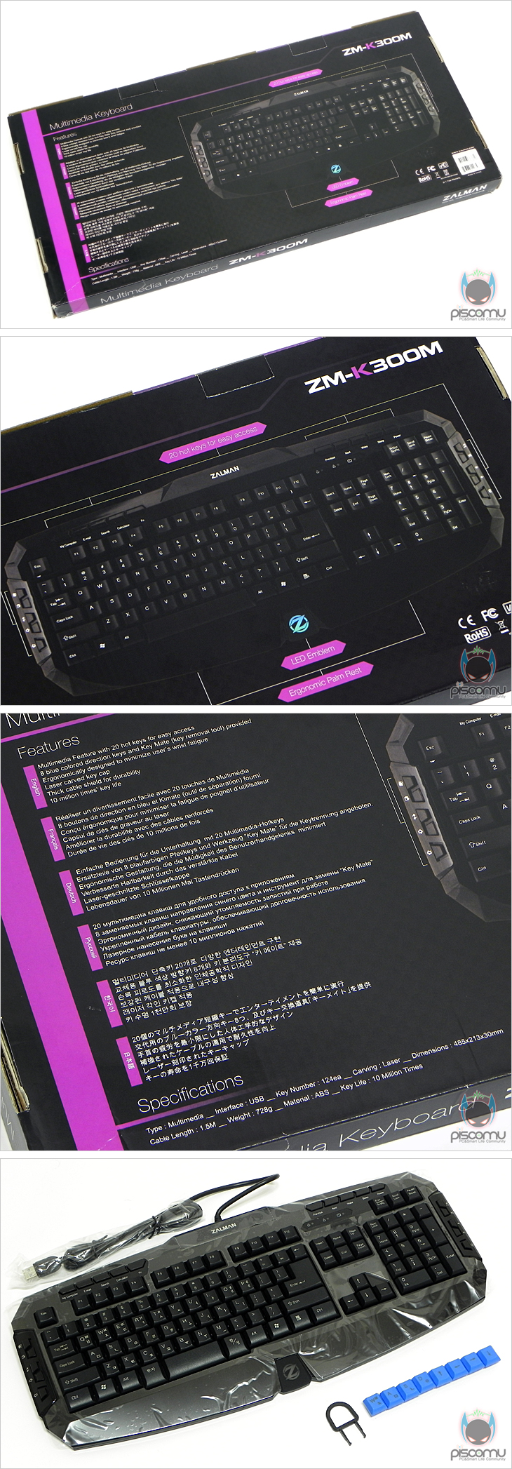 ZM-K300M은 앞선 2종(ZM-K200M/K350M)과 마찬가지로 멀티미디어 핫 키를 지원하는 제품입니다. 그리고, 저가형 라인업에서 가장 상위 모델이라 핫 키 지원도 20개로 가장 많습니다. 이는 제품 박스를 통해 쉽게 바로 확인할 수 있으며, 역시 앞서 모델들과 마찬가지로 제품 디자인 삽입도 해놔서 박스 개봉 전 제품 디자인을 확인할 수 있겠습니다. 또한, 박스 후면에는 멀티미디어 핫 키 배치를 한 눈에 확인할 수 있으며, 엠블럼 LED와 일체형 팜레스트 디자인 특징과 각 나라 언어별 제품 소개, 제품 기본 사양 스펙 정보도 확인할 수 있습니다. 제품 구성은 간단하게 키보드와 게임시 주로 사용하는 주요키와 방향키를 빠르게 시야인식 확인할 수 있게 ZM-K200M과 마찬가지로 6개의 블루 키 캡과 키 캡을 분리할 수 있게 해주는 키 메이트가 제공되겠습니다. 그리고, 외곽 베젤 부분은 유광 처리로 되어있어 제품 초기시 보호비닐이 부착되어 있겠습니다.