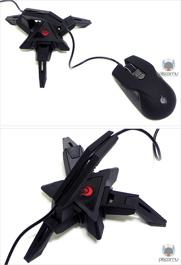 직접, 스콜피온(Skorpion)을 사용해 보았습니다. 마우스 케이블은 고무재질이 마운트 홈에 끼워 꼬임이 생기지 않게 해주며, 홈에서 쉽게 분리가 되지 않게 잘 잡아줍니다. 또한, 사용자가 케이블 길이는 조금 짧게 했을 시, 거치대가 움직일 수 있는데, 이부분 역시도 몸체의 무게추 영향으로 쉽게 들리지 않는 편입니다. 물론, 사용자가 격한 마우스 이둥 움직임에 따라 거치대가 움직일 수 있지만, 일반적인 슬라이딩이나 브레이킹 움직임에 대해서는 거치대가 들리지 않겠습니다.