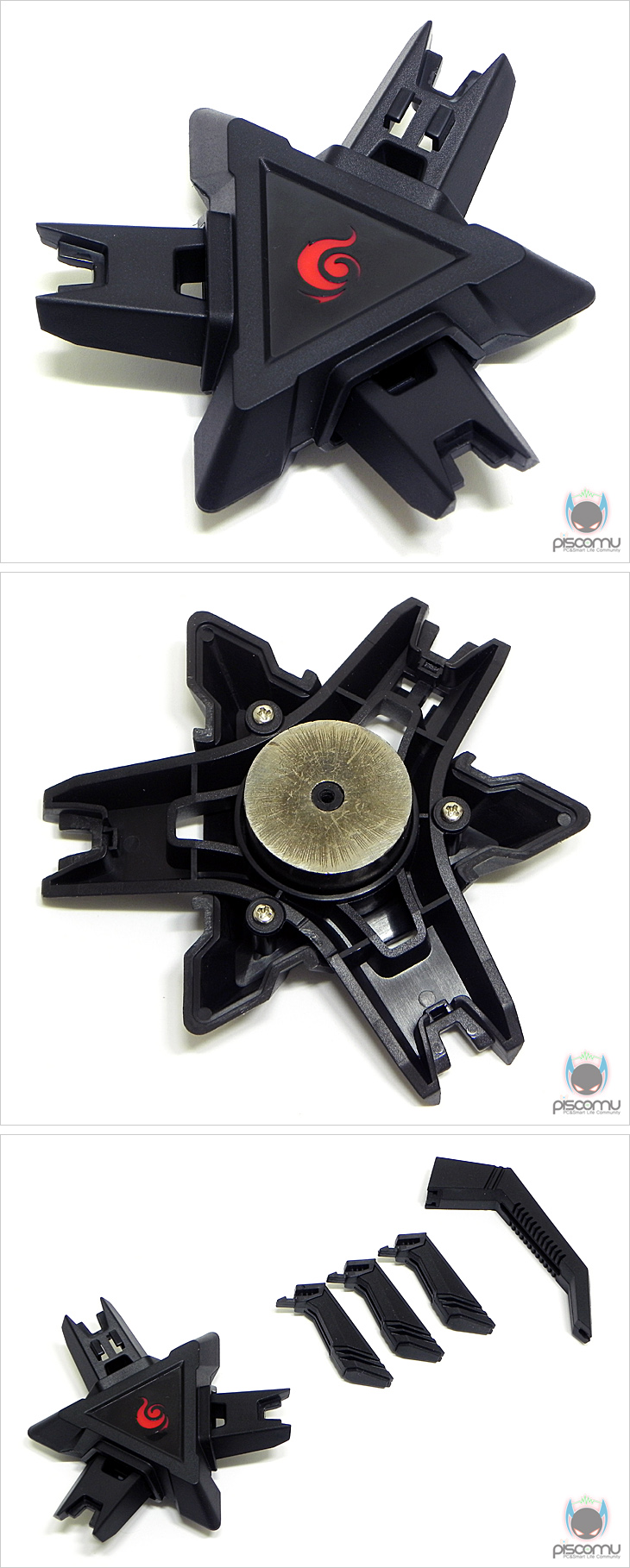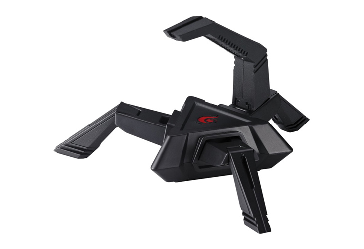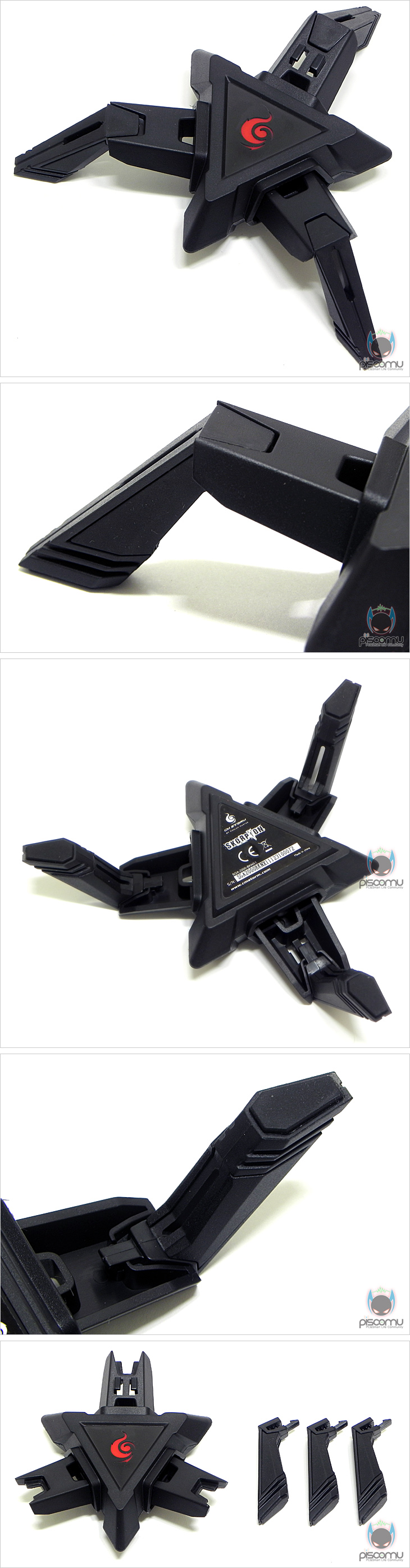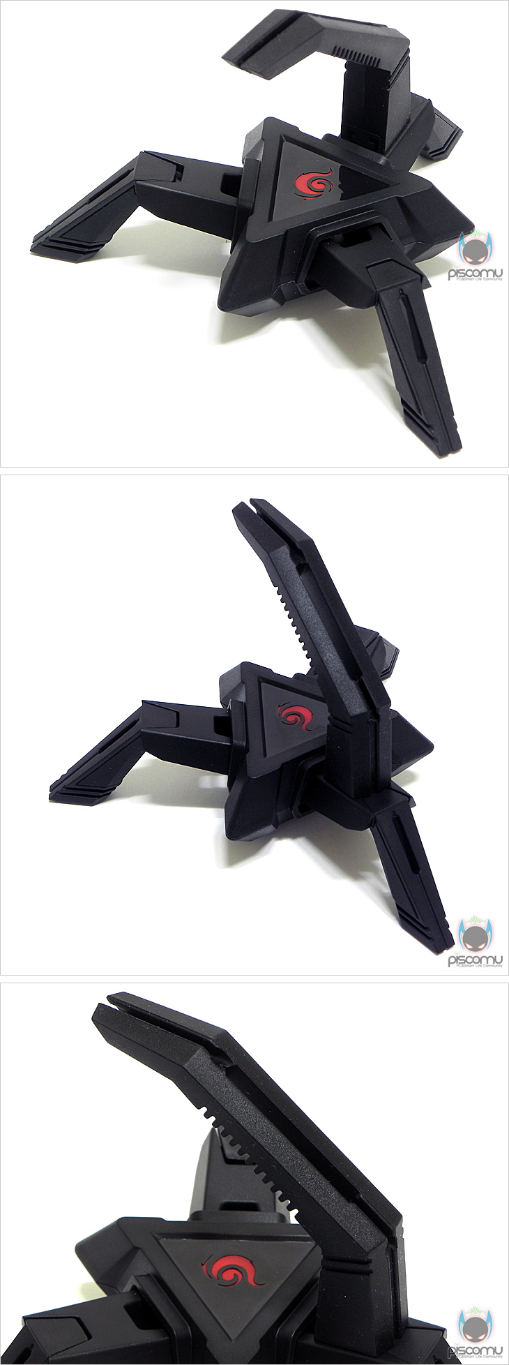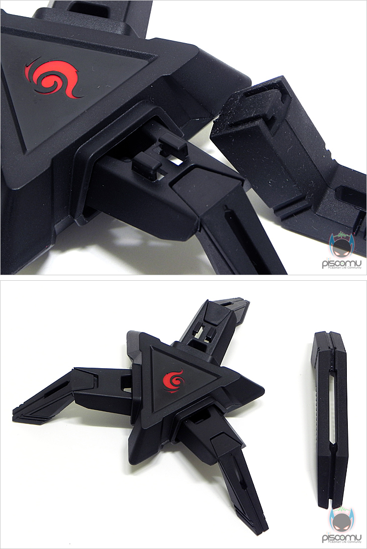 스콜피온(Skorpion)을 살펴보면, 모델명답게 전체적인 모양은 전갈 형상을 떠올리게 해줍니다. 제품 구분은 크게 몸체와 다리, 그리고 마우스 케이블을 고정해주는 마운트로 나뉠 수 있는데, 케이블 마운트 부분은 고무 재질을 적용해 케이블은 고정해주면서 마우스의 이동성은 유지해주도록 했습니다. 또한, 케이블 마운드는 홈에 끼우는 방식으로 장착이 되어 쉽게 분리가 가능하겠습니다. 이번엔 몸체와 다리 부분을 살펴보는데, 총 3개의 다리를 갖추고 있는데 약 120° 각도로 구부려 거치대를 받쳐주겠습니다. 또한, 바닥과 맞닿는 다리 끝부분에는 밑면에 고무패드를 부착해 거치대가 잘 움직이지 않도록 했으며, 다리부분 역시 걸쇠식으로 몸체와 연결되어 쉽게 분리가 가능하겠습니다. 몸체는 가운데 제조사 게이밍 브랜드 로고가 새겨져 있으며, 내부에는 거치대를 지지해주는 97g의 무게추가 적용되어 있겠습니다. 케이블 마운트, 다리, 몸체로 분리되는 이번 제품은 쉽게 말해 분리형 조립식 마우스 거치대라 할 수 있으며, 현재의 마우스 거치대와는 약간 차별화를 줬다할 수 있겠습니다.