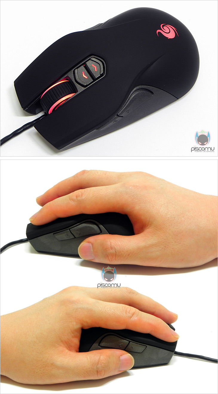 직접, Recon을 사용해 보았습니다. 별도의 드라이버 설치없이 바로, USB 포트에 연결하면 사용할 수 있는데, 연결 작동과 함께 바로 휠-버튼과 DPI 버튼, 로고 부분의 레드 LED 램프를 확인할 수 있겠습니다. 그립 형태는 제조사 홈페이지를 통해서도 분류되어있는데, 감싸는 형태 즉, Palm 형태가 되겠습니다. 실제 그립감도 마우스를 잡는 듯한 그립감이라 마우스를 장시간 사용해도 편안하다 생각됩니다. 그리고, 양손 모두 사용이 가능하겠습니다. Recon 역시 기본 구성품에는 제공되지 않지만, 별도로 홈페이지를 통해 전용 프로그램을 지원하고 있습니다. 프로그램을 실행하면 기본 프로파일을 불러와 실행하고 있는데, 한 가지 유의할 점은 기본 프로파일 경우 설정 변경이 불가능합니다. 즉, 기본값 유지를 위함이라 보면 되겠으며, 각 기능과 매크로, LED 색상 등 설정을 변경하기 위해서는 프로파일을 추가해서 변경 설정해야하겠습니다. 그리고, 프로그램 설치와 함께 펌웨어 지원도 함께 지원되고 있으니, 최신 펌웨어가 나오면 업데이트를 할 수 있겠습니다. 메뉴별로 좀 더 살펴보면, 버튼 메뉴에는 9개의 각 버튼 기능을 변경할 수 있는데, 양쪽 측면 버튼이 모두 웹페이지 앞/뒤 기능으로 설정되어 있어, 왼손이든 오른손이든 한쪽 측면 버튼은 다른 기능으로 바꾸는 것이 기본 사용으로 좀 더 적절할 것으로 생각됩니다. 참고로 LED 색상을 변경하기 위해서는 프로파일을 변경해야 하기 때문에, 기본 사용으로 한다면, 프로파일 스위치 기능으로 설정할 것을 추천합니다. 센서 메뉴를 통해서는 DPI설정과 전송제어 속도(Rolling Rate), 더블 클릭 속도 등을 설정할 수 있으며, 매크로는 최대 36개 기록이 가능하며, 프로파일은 최대 5개를 지원하고 있겠습니다. 그리고, 메뉴 가운데인 GLOW는 LED 색상 설정부분으로 훨-버튼과 기본 DPI 버튼, 그리고 로고부분을 각기 다른 색으로 변경이 가능하겠습니다. 즉, 단색 통일부터 최대 3가지 각기 다른 색으로 설정이 가능하겠습니다. 색상 지원은 10가지 색이며, LED 모드도 3가지 Continuous(계속 켜짐 상태), Flash on Profile Switch(켜짐 상태에서 프로파일 변경시 깜박임), Rapid Fire(켜짐 상태에서 클릭시 깜박임)를 지원하고 있어 사용자가 다양하게 설정할 수 있겠습니다. 다만, 색상 변경을 기본적으로 프로그램을 실행해서 변경해야하는 번거로움이 있기 때문에, 이를 좀 더 편하게 변경하고 싶다면, 각 프로파일에 저장된 색상을 앞서 언급했듯이 버튼 중 1개나 2개를 프로파일 변경 기능으로 설정하는 것이 좀 더 설정 적용에 쉬울 것으로 생각됩니다. 마우스 위주의 게임에 Recon을 장시간 사용해 보았습니다. 클릭 압력은 가벼운 편이라 장시간에도 손가락 피로감은 적은 편이며, 휠 역시 스크롤이 부드러운 편이라 사용하기 편합니다. 포인트 인식 속도도 즉각 보입니다. 4가지 DPI는 사용자 편의에 따라 선택하면 되겠지만, 일반 사용자라면 800과 1600DPI가 무난하겠습니다. 슬라이딩과 브레이킹도 자연스러워 무난합니다. 다만, 마우스 뒷부분 손바닥 그립부분 경사가 큰 편이라 사실상 높이는 높지 않은데, 높다라는 느낌을 받을 수 있겠습니다.