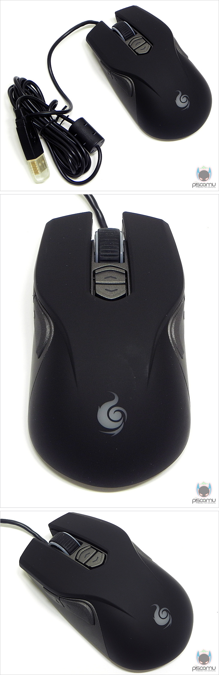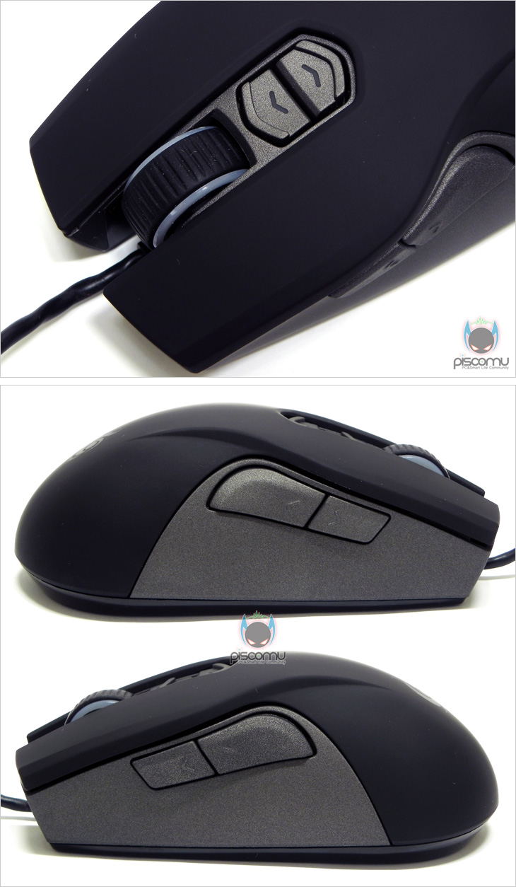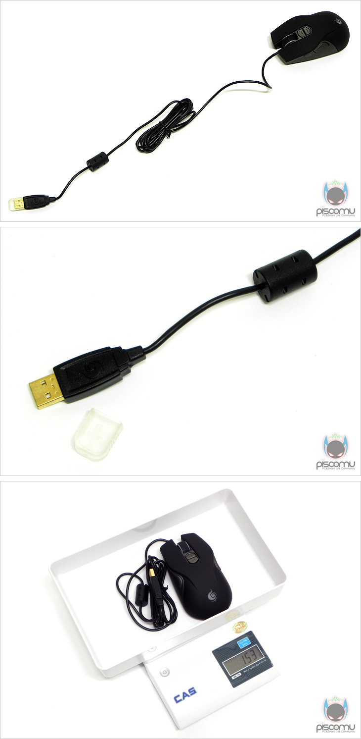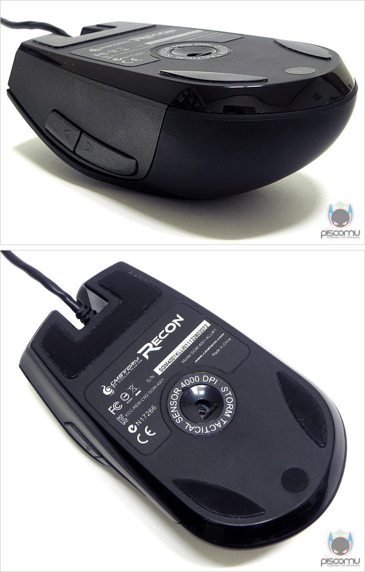 Recon을 살펴보면, 좌우 대칭형으로 왼손/오른손 모두 사용이 가능한 양손잡이 지원임을 알 수 있으며, 상단 커버(블랙) 표면은 미끄럼이 적고 그립감을 높이기 위해 고무 코팅으로 처리가 되어있습니다. 그리고, 그립 뒤부분에는 CM STORM 로고가 새겨져 있는데, 작동시 LED에 의한 튜닝효과를 볼 수 있습니다. 버튼 지원을 확인해 보면, 기본 좌우 버튼을 비롯해 가운데 휠-버튼은 고무 재질 적용과 촘촘한 홈처리로 정확한 스크롤을 위해 접지력을 높였습니다. 또한, 휠 양쪽에는 작동시 LED 튜닝효과를 볼 수 있게 처리를 해놨습니다. 휠-버튼 바로 뒤에는 DPI Up/Down 기능을 기본적으로 가능 버튼 2개가 배치되어 있습니다. 그리고, 마우스 양 측면에는 각각 2개의 버튼이 추가로 더 배치되어 총 9개의 버튼 지원을 확인할 수 있겠습니다. 참고로 기본 좌우 버튼 스위치는 옴론(omron)사 스위치가 적용되어 있겠습니다. 또한, DPI는 800/1600/3200/4000 순으로 변경이 가능하겠습니다. 마우스 밑면을 보기 전 바닥 테두리 부분을 보면 유일하게 유광 처리된 것을 확인할 수 있습니다. 마우스 밑면에는 부드러운 움직임을 위해 기본 테프론 피트를 앞/뒤 위치에 각각 부착을 했으며, 가운데 부분에 센서가 위치해 있는데, 센서는 앞서 제품 박스에서 확인했듯, Avago사의 ADNS-3090 센서가 적용되어 있겠습니다. 케이블 길이는 1.8m로 충분한 길이를 가졌으며, 연결 인터페이스는 USB 방식이 되겠습니다. 그리고, 신호손실을 줄이기 위해 노이즈 필터 적용과 포트 금도금처리를 확인할 수 있으며, 마우스를 사용하지 않을 시 포트 금속부분 부식방지를 위해 쉴드가 제공되겠습니다. 마우스 무게는 153g입니다.