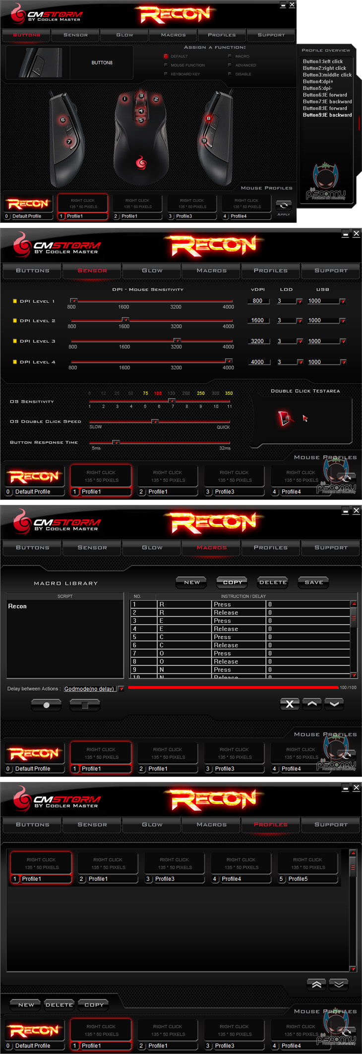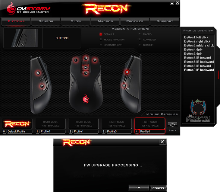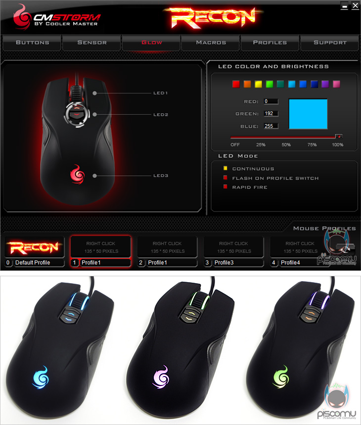 쿨러마스터의 CM STORM 올해 첫 게이밍 마우스인 Recon은 기존 제품인 Spawn에 이어 두 번째 Avago ADNS-3090센서가 적용된 모델입니다. Spawn은 Claw 그립타입이고, 이번 Recon은 Palm 그립타입입니다. 따라서, Spawn에서 Palme 그립이 아쉬웠던 소비자는 Recon이 이부분을 채워줄 제품이라 생각하면 좋을 것 같습니다. 물론, 그립감이나 반응 속도도 만족스러운 편이고, 특히, 3색 멀티 LED 지원을 하고 있어 좀 더 시각적으로는 Spawn보다 Recon이 좋다라는 매리트도 있습니다. LED 경우도 화사하지 않게 은은하게 발휘되어서 눈에 자극적이지 않습니다. 또한, 9개의 버튼 지원과 매크로 지원도 갖추고 있어 게이밍 마우스로썬 잘 갖추고 있습니다. 다만, 프로그램 지원에서 기본 프로파일의 설정을 변경할 수 없다라는 점은 조금 아쉽습니다. 추후 버전에서 개선되길 바래봐야 하겠습니다. 기능과 시각적으로 잘 갖춘 마우스라 가격부분과 소비자를 만족시키면 좋은 반응이 있을 것이라 생각됩니다.