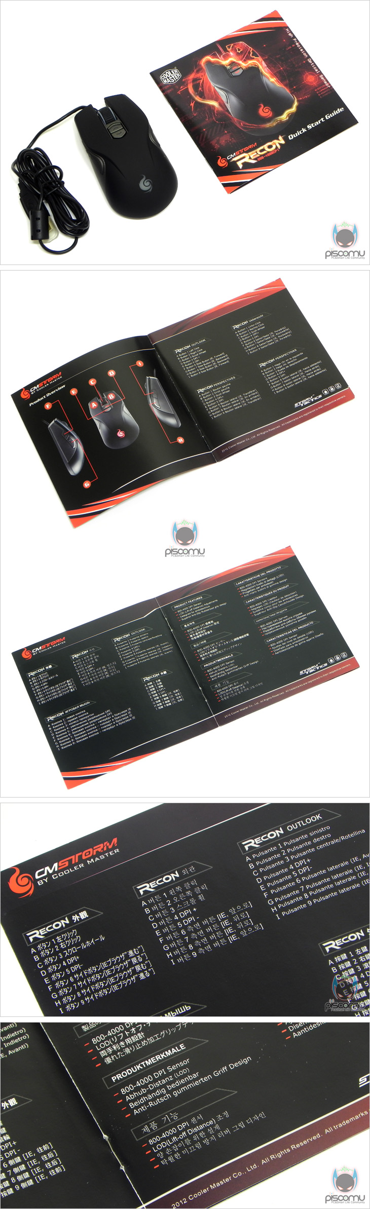 Recon은 옵티걸 마우스로 제품 박스를 통해서 쉽게 알 수 있습니다. 또한, 제품의 특징에 대해 간략한 문구로 전면에 소개하고 있는데, 센서, 그립, 매크로, 휠버튼에 대해 언급을 하고 있겠습니다. 또한, 경쟁 제품들과 마찬가지로 전면 오픈 페이지를 적용해 내부에 포장된 마우스를 바로 확인할 수 있습니다. 페이즈 안쪽에는 마우스 부위별 기능과 내부 기술 지원에 대해 소개를 하고 있습니다. 이 밖에도 박스에는 제품에 대해 좀 더 알고 싶으면 자사 웹 사이트를 방문하라는 각 나라별 문구와 운영체제 지원 여부도 확인할 수 있으며, 박스 후면에는 제품의 기본 스펙 정보를 담고 있어 센서 칩 종류나 DPI 지원 범위, 매크로/프로파일 지원, 전송제어 속도(Rolling Rate), 케이블 길이, 제품 사이즈 등 자세히 표기해 소비자가 구입 전 충분한 도움이 되도록 해주고 있습니다. 제품 구성은 마우스와 설명서로 간단하게 이루어져 있으며, 설명서에는 마우스 부위별 설명과 스펙 정보를 각 나라별 언어로 소개하고 있는데, 한국어도 기본 포함되어 있겠습니다.
