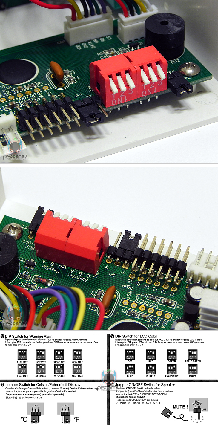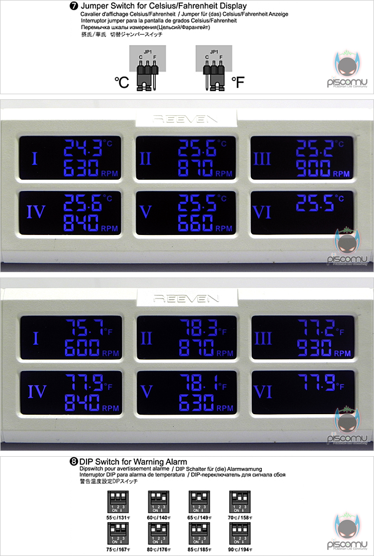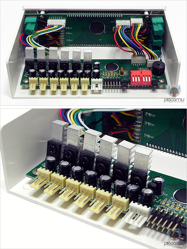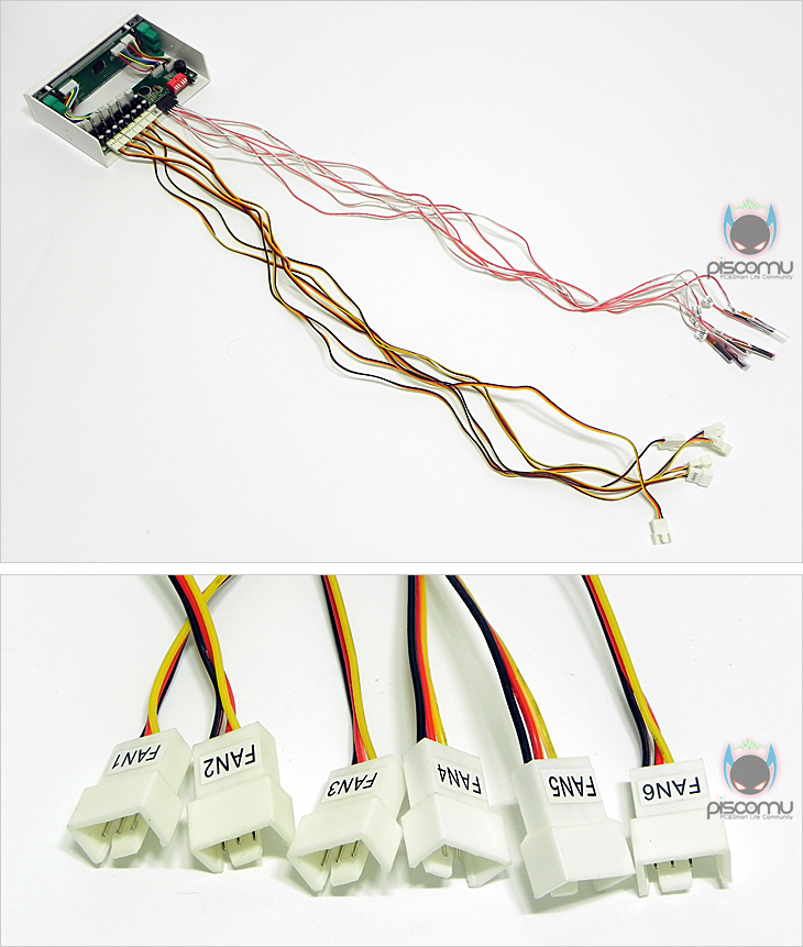 SIX EYES를 살펴보겠습니다. 베젤(Bezel)을 모두 플라스틱으로 되었으며, 전면에는 6개의 온도와 팬 속도를 보여주는 LCD가 3개씩 위아래 총 6개 배치되어 있습니다. 그리고, LCD 양쪽 끝부분에는 팬 속도를 조절할 수 있는 노브(knob)가 각각 3개씩 배치되어 있겠습니다. 노브는 푸쉬(Push) 기능이 있어 누르면 안으로 들어가고 다시 누르면 앞으로 나옵니다. 즉, 팬 속도를 조절할 시에는 노브를 앞으로 나오게 해 조절하고, 조절 후 사용하지 않을 시에는 다시 눌러 넣어 깔끔하게 보이게 할 수 있습니다. 대부분 노브식 조절의 팬 컨트롤러 제품들이 고정형태로 있어 전면 도어가 있는 케이스 경우 장착을 못하는 경우가 있는 SIX EYES는 이를 도어 간섭없이 장착이 가능하겠습니다. 내부를 살펴보면, 왼쪽에는 제공되는 6개의 팬 케이블과 연결되는 커넥터(Connecter)가 6개 배치되어 있으며, 각 커넥터 별로 일정 전압유지가 될 수 있도록 개별식 캐패시터(Capacitor)를 지원했습니다. 개당 캐패시터 용량은 16V/220㎌(마이크로패럿)을 가지고 있습니다. 오른쪽에는 6개의 온도센서 케이블과 연결되는 커넥터가 배치되어 있으며, 바로 옆에는 점퍼 설정으로 섭씨(℃)와 화시(℉)를 변경할 수 있게 점퍼가 배치되어 있습니다. 그 옆에는 스위치 형태로 2개가 배치되어 있는데, 각각 알람 설정과 LCD 색상(Color) 설정 스위치로 제공되는 설명서를 참고하면 쉽게 적용 사용할 수 있겠습니다. 케이블은 앞서 구성품에 확인했듯이 팬 케이블 6개와 온도센서 케이블 여유분 1개를 포함 총 7개가 제공됩니다. 두 케이블 모두 일반 핀 형태이기 때문에 다른 팬 케이블이나 온도센서 케이블로도 호환 사용이 가능합니다. 각 케이블 길이는 팬 케이블이 약 69cm, 온도센서 케이블은 약 67cm로 무난한 길이를 가지고 있겠습니다. 또한, 팬 케이블 경우 팬과 연결되는 커넥터 부분이 3핀이지만, PWM형태를 가지고 있어 PWM 팬을 3핀으로 전환해 컨트롤 할 수 있겠습니다.