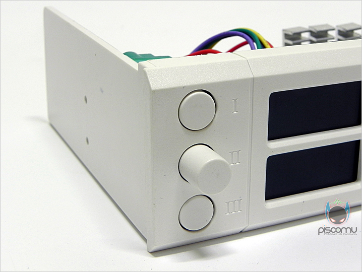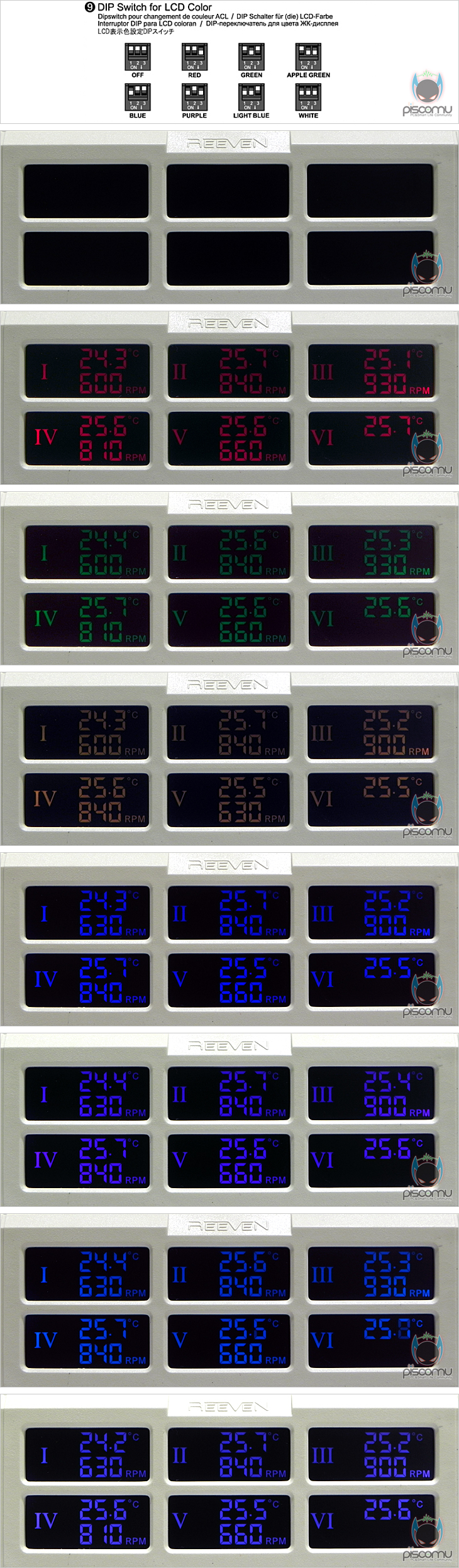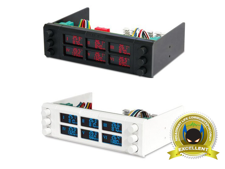 SIX EYES를 직접, 사용해 보았습니다. 총 5개의 팬을 연결해 사용해 보았는데, 팬 중에는 PWM방식 팬도 포함되어 있습니다. 일단 작동을 시키면, 팬이 연결된 상태라도 LCD창 팬 속도가 안 나옵니다. 그 이유는 노브 초기상태가 왼쪽으로 다 돌려져 있어 팬 Off가 되어있기 때문입니다. 노브를 돌려 팬을 작동시키면 팬 속도와 함께 LCD창에 온도값이 나오는데, LCD창에는 왼쪽에 로마표기법의 번호가 표시되며, 오른쪽 위에는 온도, 아래에는 팬 속도가 표기되겠습니다. 팬 속도 조절 단위는 30RPM식 조절됩니다. LCD 시야각은 전면은 물론, 좌우상하 어느 위치에서 보더라도 선명하게 잘 보여주는 편입니다. 특히, 전면과 상좌우가 가장 선명하게 잘 보여줍니다. 다른 팬 컨트롤러 제품들에 비해 LCD 시야각이 상당히 좋은 편이라 할 수 있겠습니다. 그리고, 앞서 내부에서 점퍼 설정으로 변경되는 섭씨(℃)와 화시(℉)의 온도표기도 점퍼 설정으로 변경되는 것을 확인할 수 있겠습니다. 또한, 온도에 따른 알람 설정 스위치도 지원되기 때문에 온도에 민감한 사용자라면 온도 스위치도 함께 적용하면 좋겠습니다. 끝으로, 색상(Color) 스위치에 따른 LCD 색상을 확인해 보면, 스위치를 모두 Off한 상태에선 LCD창이 Off되고, 나머지 각 스위치 On 조합으로는 빨강(Red), 녹색(Green), 황록색(Apple Green), 파랑(Blue), 보라(Purple), 담청(Light Blue), 흰색(White) 총 7가지 색상으로 변경 설정이 가능합니다. 물론, 작동 중에서도 변경이 가능합니다. 조금 아쉽다면, 흰색 경우는 전면보다는 측면에서 볼 때 확실히 흰색 구분이 확인된다라는 점을 지적할 수 있겠습니다.