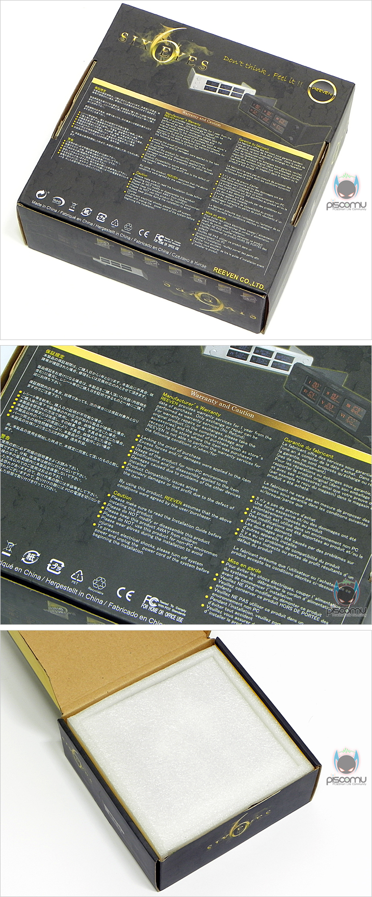 SIX EYES는 모델명 그대로 6개의 팬을 속도 조절할 수 있는 팬 컨트롤러 제품입니다. 색상(Color)은 블랙(Black)과 화이트(White) 2가지 색상으로 출시되었으며, 5.25인치 베이(Bay)에 장착되는 제품입니다. 또한, 팬 컨트롤 외에도 6개의 온도센서 측정이 가능하며, 7가지 LCD 컬러 지원, 경고음 지원 등의 부가 기능들도 함께 지원되고 있습니다. 이는 제품 박스를 통해 쉽게 파악할 수 있습니다. 또한, 각 나라별 언어로 제품의 크기 및 스펙 사양을 소개하고 있는데, 아쉽게 한국어는 포함되어 있지 않습니다. 스펙 사양을 통해서 온도센서는 100℃까지, 팬 속도는 9990RPM까지 측정/조절할 수 있음을 알 수 있겠습니다. 박스 후면에는 주의사항에 대해 언급하고 있는데, 역시 한국어는 포함되어 있지 않습니다. 포장은 스티로폼을 사용해 외부 충격에 파손되지 않도록 했습니다. 제품 구성은 설명서를 비롯해 로고 스티커, 전원 케이블, 6개 3핀(Pin) 팬 케이블, 7개의 온도센서 케이블, 센서 접착테이프, 스크류, 그리고 팬 컨트롤로 이루어져 있겠습니다. 제품 설명서에는 제품의 각 부위별 명칭과 기능 사용법을 담고 있겠습니다.