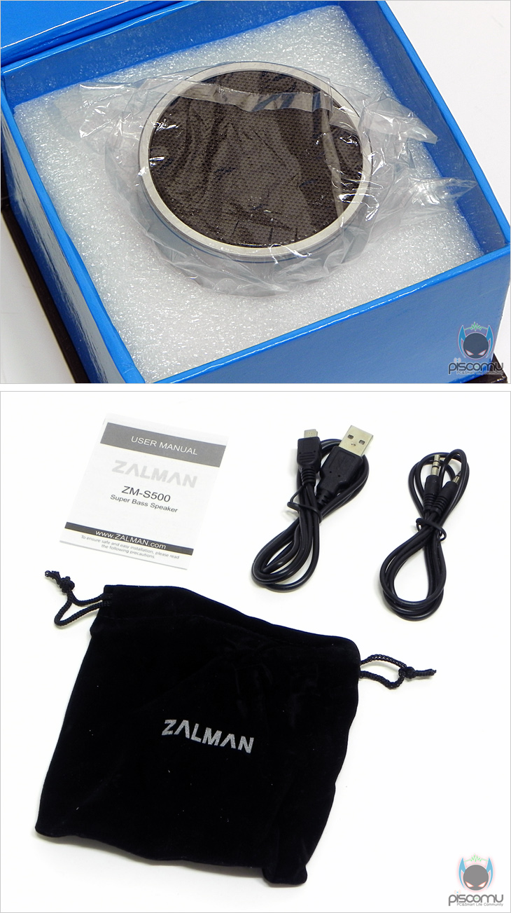 ZM-S500은 휴대용 포터블 스피커답게 제품 박스도 크기(109x106x76mm)도 작습니다. 다기능 스피커라는 문구와 함께 제품 박스에 제품 이미지가 삽입되어 개봉 전 미리 제품의 디자인을 확인할 수 있으며, 이번 제품에 적용된 특허 기술에 대해 소개를 해주고 있습니다. 이 밖에도, 제품의 기본 스펙 정보를 통해 제품의 크기와 배터리 용량 등을 확인할 수 있는데, 배터리는 내장형 리튬 배터리로 반복 충전으로 사용할 수 있습니다. 그리고, 각 나라별 언어로 제품 특징을 소개하고 있는데, 한국어도 포함되어 있으며, 특징 소개에서 방수기능과 평균 사용 시간대 등을 확인할 수 있겠습니다. 포장은 스피커 크기에 맞춰서 우렌탄폼으로 감싸고 있으며, 외부 충격에 파손 방지를 해주겠습니다. 구성품은 설명서를 비롯해, USB충전 케이블, 오디오 케이블, 스피커 휴대시 담을 수 있는 파우치를 제공해주겠습니다.