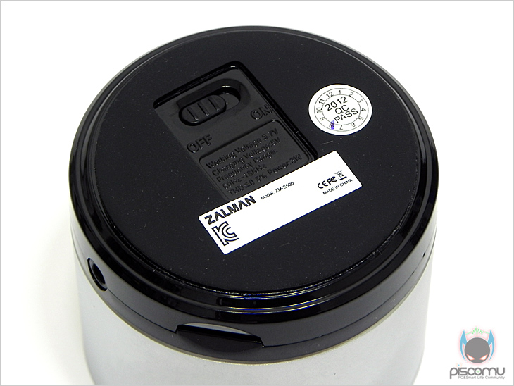 ZM-S500을 살펴보겠습니다. 전체적인 디자인은 원통형으로 지름 6cm에 높이 5cm를 가진 포터블 스피커에서도 미니 스피커에 해당되는 크기를 가졌습니다. 손에 감싸 잡을 정도의 크기라 다른 포터블 스피커보다 휴대성이 더 강하다 할 수 있겠습니다. 무게는 측정결과 225g이 되겠습니다. 역시 휴대하기에 부담없는 무게라 할 수 있습니다. 좀 더 살펴보면, 전면 제조사 로고 아래에는 가운데 재생/일시정지 버튼을 비롯해 양쪽에 각각 볼륨 조절 버튼이 배치되어 있습니다. 그리고, 오른쪽 측면에는 충전시 상태를 확인할 수 있는 램프가 배치되어 있는데, 충전시에는 Red빛을, 완충시에는 Off되고, 재생시에는 Green빛을 보여주겠습니다. 후면에는 가운데 3.5mm 규격의 오디오 잭을 비롯해 왼쪽에는 micro SD카드 삽입구가 있으며, 오른쪽에는 USB충전 케이블과 연결되는 포트가 배치되어 있겠습니다. 기본적으로 스마트폰 같은 휴대기기와 연결해 사운드를 들려주는 것은 물론, micro SD(6GB이하)만 꽂아서도 저장된 MP3 사운드를 들려주겠습니다. 밑면에는 전원 On/Off 스위치가 배치되어 있으며, 미끄럼 방지를 위해 흔히 차량 용품에 사용되는 Non-Skid Pad를 적용해 바닥과의 접지력을 높였습니다.
