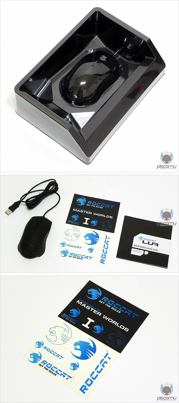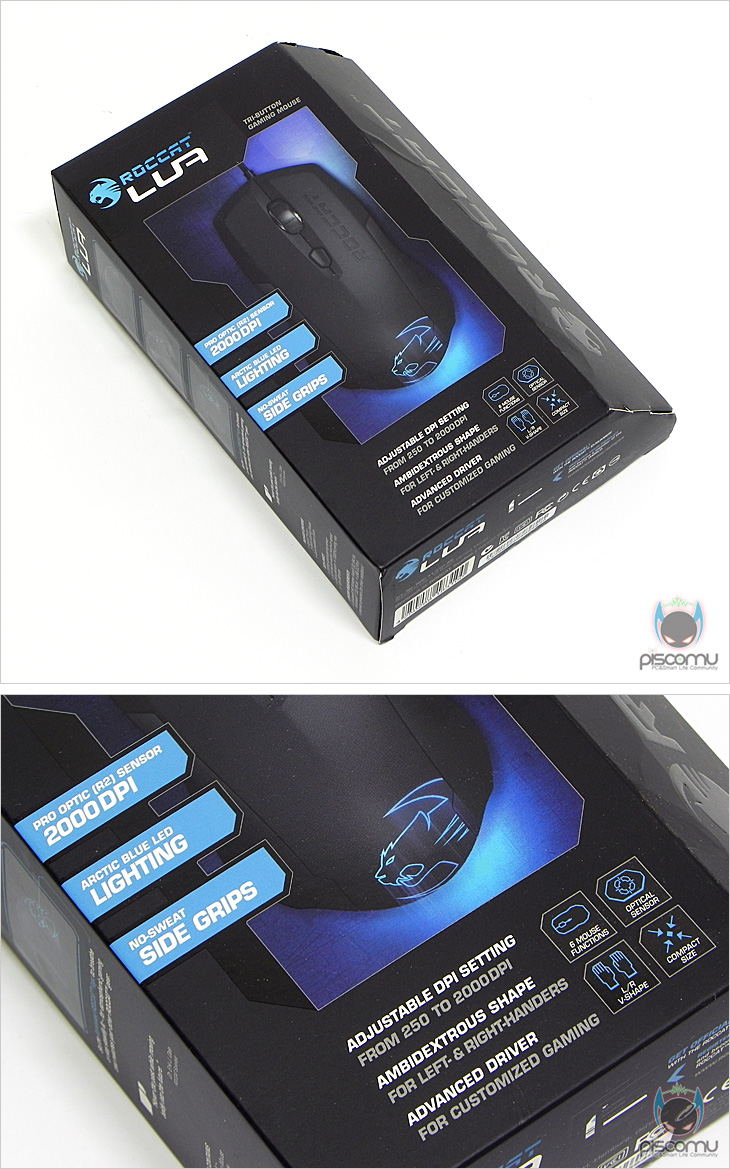 Lua를 살펴보면, 일단 제품 박스 형태는 기존 제품들과 큰 차이가 없습니다. 오른쪽 면이 대각선으로 깎인 것이 이번 제품에서도 확인을 할 수 있겠습니다. 박스 전면에는 모델명을 비롯해, DPI지원, 블루(Blue) 라이트닝(Lighting) 지원, 사이드 땀 발생 방지 그립(No-Sweat Side Grips), 광 센서 등의 제품 특징을 언급해주고 있습니다. 박스 측면에는 마우스의 디자인 이미지를 삽입해 미리 측면, 전면, 후면의 볼 수 있게 해주고 있으며, 팩키지 구성품 목록, 기본 스펙 사양, 운영체제 지원여부도 표기를 해놨습니다. 박스 후면에는 제품의 부위별 특징을 이미지와 함께 소개해주고 있습니다. 그리고, 각 나라별 언어로도 제품 특징을 소개하고 있는데, 한국어도 기본 포함이 되어있겠습니다. 제품 포장은 일반 마우스 제품 포장과 동일하게 마우스 크기에 맞춘 캡(CAP) 방식으로 포장을 했습니다. 제품 구성은 마우스를 비롯해, 처음으로 제공되는 ROCCAT 엠블렘 스티커, 그리고, 제품 설명서로 이루어져 있겠습니다.