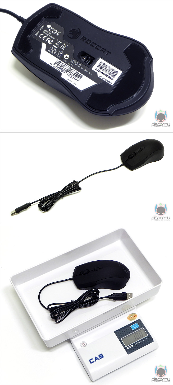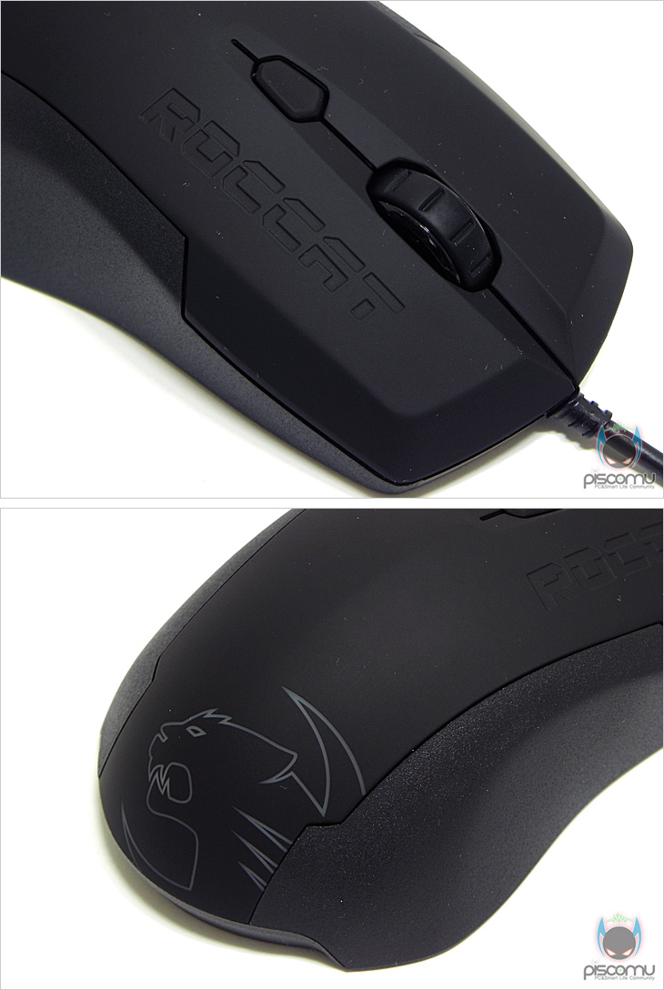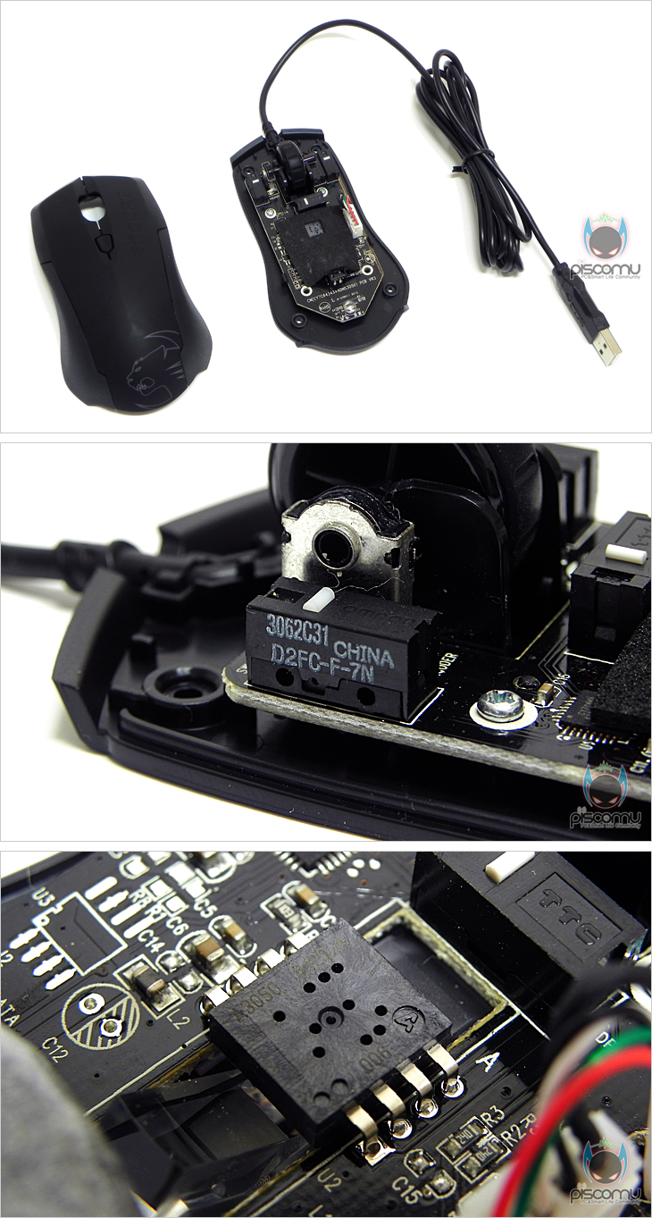 Lua를 살펴보면, 전체적인 색상은 Lua 출시 전 최근 모델인 Savu와 마찬가지로 블랙(Black) 색상을 가졌습니다. 그리고, 양쪽 대칭형으로 왼손/오른손 모두 사용이 가능하도록 지원을 했습니다. 그리고, 이번 Lua가 보급형 제품이라는 점을 바로 버튼 수 지원에서 알 수 있는데, 전형적인 기본 좌우 버튼과 가운데 휠 버튼, 그리고 휠-버튼 뒤에 DPI값을 변경해주는 스위치 버튼까지 보급형 게이밍 마우스에서 볼 수 있는 가장 기본적인 버튼 지원이라 할 수 있겠습니다. 그리고, 왼쪽 버튼에는 제조사 로고가 음각으로 새겨져 있으며, 휠 버튼은 접지력을 높여 정확한 스크롤리 되도록 톱니 바퀴 모양에 고무재질을 적용했습니다. 또한, 그립 뒷부분에는 제조사 엠블렘이 새겨져 있는데, 작동시 블루 라이트닝 효과를 줘서 튜닝효과를 볼 수 있도록 지원했습니다. 측면은 그 동안의 자사 제품들처럼 사용시 땀 발생이 최소화되도록 특수 표면 처리를 해놨습니다. 표면은 거칠고, 우측 앞부분에는 모델명을 음각으로 새겨놨습니다. 또한, 그동안 자사에서 꾸준히 지원하면 측면 버튼은 이번에 지원되지 않았습니다. 역시 이부분만 보더라도 이번 모델이 보급형이라는 점을 알 수 있습니다. 마우스 밑면에는 앞뒤 위치에 비교적 넓은 면적으로 테프론 피트를 기본 부착해 부드러운 마우스 움직임을 지원했으며, 가운데는 광 센서가 위치해 있겠습니다. 유선 케이블 길이는 총 1.8m로 다른 마우스 제품들과 비슷한 길이를 가졌으며, 마우스의 전체 무게는 100g으로 상당히 가벼운 무게임을 확인할 수 있겠습니다. 끝으로, Lua의 내부를 잠깐 살펴보면, 기본 좌우 버튼의 스위치는 요즘 가장 흔히 사용되고 있는 Omrom사의 스위치가 적용되었습니다. 그리고, 자사에서 R2 센서라고 언급하고 있는 센서는 확인 결과, Avago사의 ADNS-3050 센서임을 확인할 수 있겠습니다. 참고로 ANDS-3050센서는 최대 2000DPI까지만 지원하고, 1개의 LED 칩을 지원한다라는 점에서 Lua가 순수 센서만의 성능을 지원하고 있음을 알 수 있겠습니다.