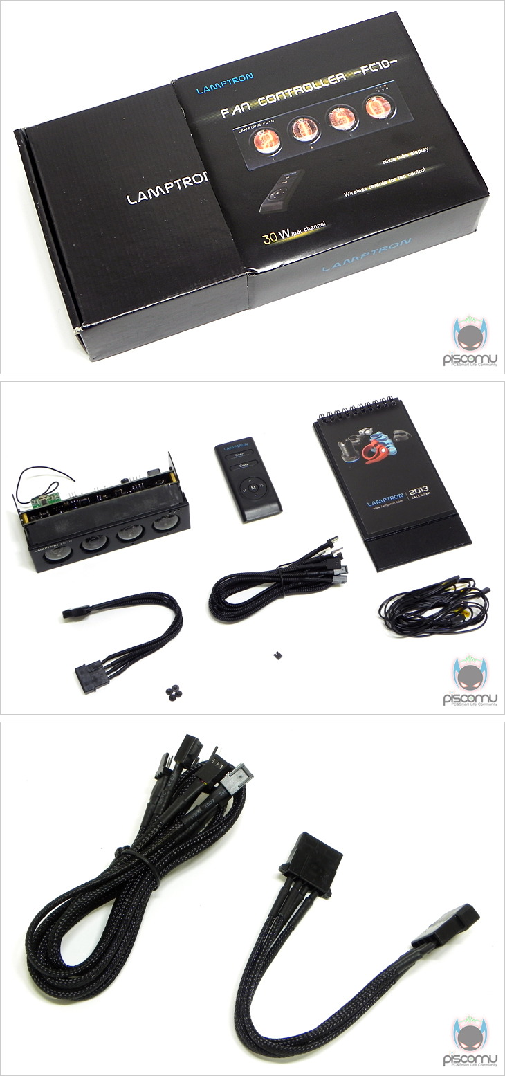 FC10의 제품 박스부터 살펴보면, 앞선 만난 제품들과 마찬가지로 박스 전면에는 해당 제품의 이미지를 삽입해 구입 전 디자인을 확인할 수 있습니다. 후에 확인하겠지만, FC10의 가장 큰 특징 중 하나는 바로 리모컨(Remote)으로 컨트롤을 한다라는 겁니다. 그리고, 채널당 전력은 30W가 공급되겠습니다. 박스 후면에는 제품에 대한 자세한 언급을 해주고 있는데, 기본적인 제품 스펙 정보부터 제품 특징, 그리고 제품 구성품 목록을 확인할 수 있겠습니다. 소비자가 구입 전, 충분한 정보를 얻을 수 있겠습니다. 제품 포장은 역시 앞서 만난 모델들과 마찬가지로 겉표지에 속박스 포장식으로 되어있으며, 제품 구성은 본 제품인 팬 컨트롤러 FC10을 비롯해, 리모컨, 카달로그 달력, 전원 케이블, 팬 케이블, 온도센서 케이블, 스크류, 점퍼로 이루어져 있습니다. 또한, 전원 케이블과 팬 케이블은 깔끔하게 슬리빙 처리를 해놨습니다. 참고로 팬 케이블 길이는 524mm입니다.