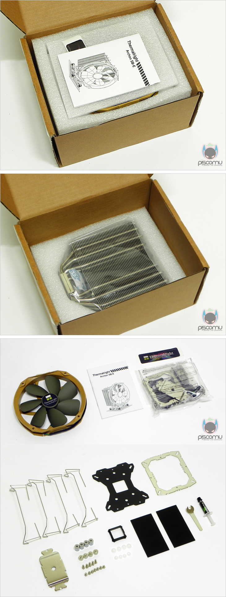 Archon(아콘) SB-E의 제품 박스는 기본 모델과 차이가 없습니다. 자사에서 가장 흔히 볼 수 있는 납품식의 박스 형태를 가지고 있는데, 제조사명과 함께 측면에 모델명을 확인할 수 있겠습니다. 이 외에 제품 박스에 특별히 기재된 정보는 없겠습니다. 제품 포장 역시 기존 모델과 마찬가지로 스티로폼을 이용한 포장으로 쿨러는 크기에 맞춰서 포장이 되어 있겠습니다. 쿨러를 비롯한 구성품에는 150mm 팬, 제품 설명서, 비닐에 동봉된 부속품으로 이루어져 있으며, 부속품에는 팬 클립, 인텔/AMD 공용인 백플레이트/마운트/마운팅 플레이트, 기본 너트, LGA2011 너트, 볼트, 백플레이트 캡, AMD용 와셔, 인텔용 와셔, 팬 방진패드, 렌치, 써멀컴파운드가 제공되겠습니다.