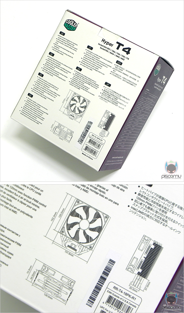 이번 쿨러마스터 Hyper T4 역시 국내 쿨러마스터 쿨러 정식수입원인 ㈜파인인포메이션에서 맡았습니다. 보증기간은 2년으로 제품박스에서 쉽게 확인할 수 있습니다. 그리고, 모델명과 최신 소켓 지원 확인을 비롯해 최근 Hyper시리즈의 공통인 DCT(Direct Contact Heatpopes) 공법과 저소음팬, 팬 브라켓 지원을 확인할 수 있습니다. 저소음팬 지원하는 문구에서 이번 모델이 성능위주의 하이엔드 모델이 아니라는 점은 짐작할 수 있겠습니다. 박스 측면에는 제품의 기본 스펙 정보가 담겨줘 있는데, 상세하게 기재를 해놔서 소비자가 구입에 있어 충분한 정보수집이 되겠습니다. 특히, 쿨러 크기를 확인할 수 있는데, 높이 152.3mm라는 점에서 일반 180mm 폭인 미들타워에서도 장착이 가능하겠습니다. 무게 역시 448g으로 비교적 가벼운 편입니다. 박스 후면에는 제품의 소개를 각 나라별 언어로 하고 있는데, 한국어는 포함되어 있지 않습니다. 그리고, 추가로 제품 도면식 이미지를 넣어 사이즈를 좀 더 자세히 표기를 해주고 있겠습니다.