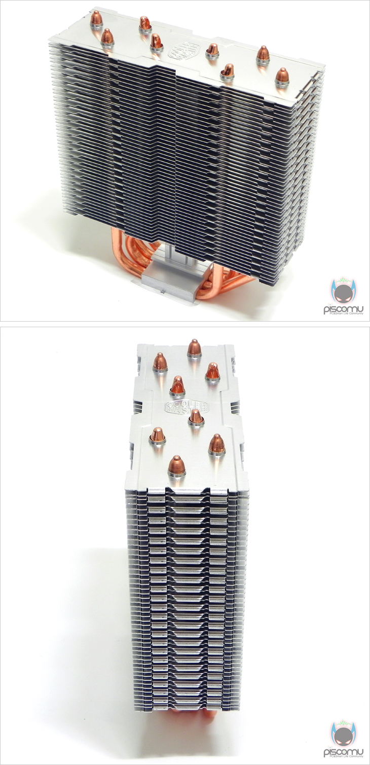 방열핀을 살펴보면, 얼핏 봐서는 방열핀 디자인이 동일한 것 같지만, 왼쪽 오른쪽 홈처리 부분이 번갈아 가면서 길이가 다를 것을 확인할 수 있습니다. 또한, 방열핀 2개 1쌍씩 측면 처리부분은 붙이는 형태로 유입되는 공기의 흐름을 흐트러지지 않게 일종의 가이드 효과가 되도록 했습니다. 그리고, 또한 측면에는 팬 브라켓이 장착될 수 있고 홈처리도 함께 되어 있겠습니다. 방열핀은 총 50개가 적용되었습니다. 히트파이프는 총 4개가 적용되었으며, U자형 구조를 취하고 있습니다. 그리고, 히트파이프와 방열핀의 통과 방식은 관통식으로 처리가 되어 있겠습니다. CPU(프로세서)와 맞닿는 베이스 부분은 히트파이프가 직접 접촉하는 DTC(Direct Contact Heatpipes) 방식으로 처리가 되어 있겠습니다.