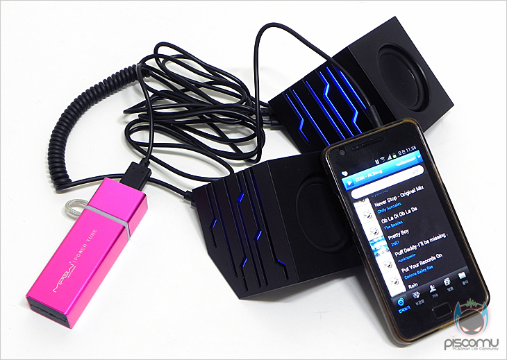 그럼, 직접 Matrix S1을 사용해보도록 하겠습니다. 바로 USB 전원 케이블을 PC나 노트북에 연결하면 전원 인가와 함께 스피커 라인을 따라 블루 LED가 작동되는 것을 확인할 수 있습니다. 그리고, PC나 노트북은 같은 USB 전원을 받을 수 있는 제품에는 앞서 제공되는 오디오 케이블을 연결하지 않아도 스피커 내부에 사운드 칩이 내장되어 있어 사운드 출력을 바로 해주겠습니다. 또한, 타블렛PC나 스마트폰 같은 휴대기기 경우엔 노트북이나 PC를 통해 USB 전원을 받는 경우에도 사용이 가능하지만, 별도로 보조배터리를 가지고 있다면, 어디에서나 보조배터리를 사용해 포터블 스피커처럼 사용도 가능합니다. 이때는 오디오 케이블을 휴대기기 오디오 포트에 연결을 해줘야 하면, 3.5 파이 단자를 지원하고 있어 대부분의 기기와는 모두 연결이 가능하겠습니다.
