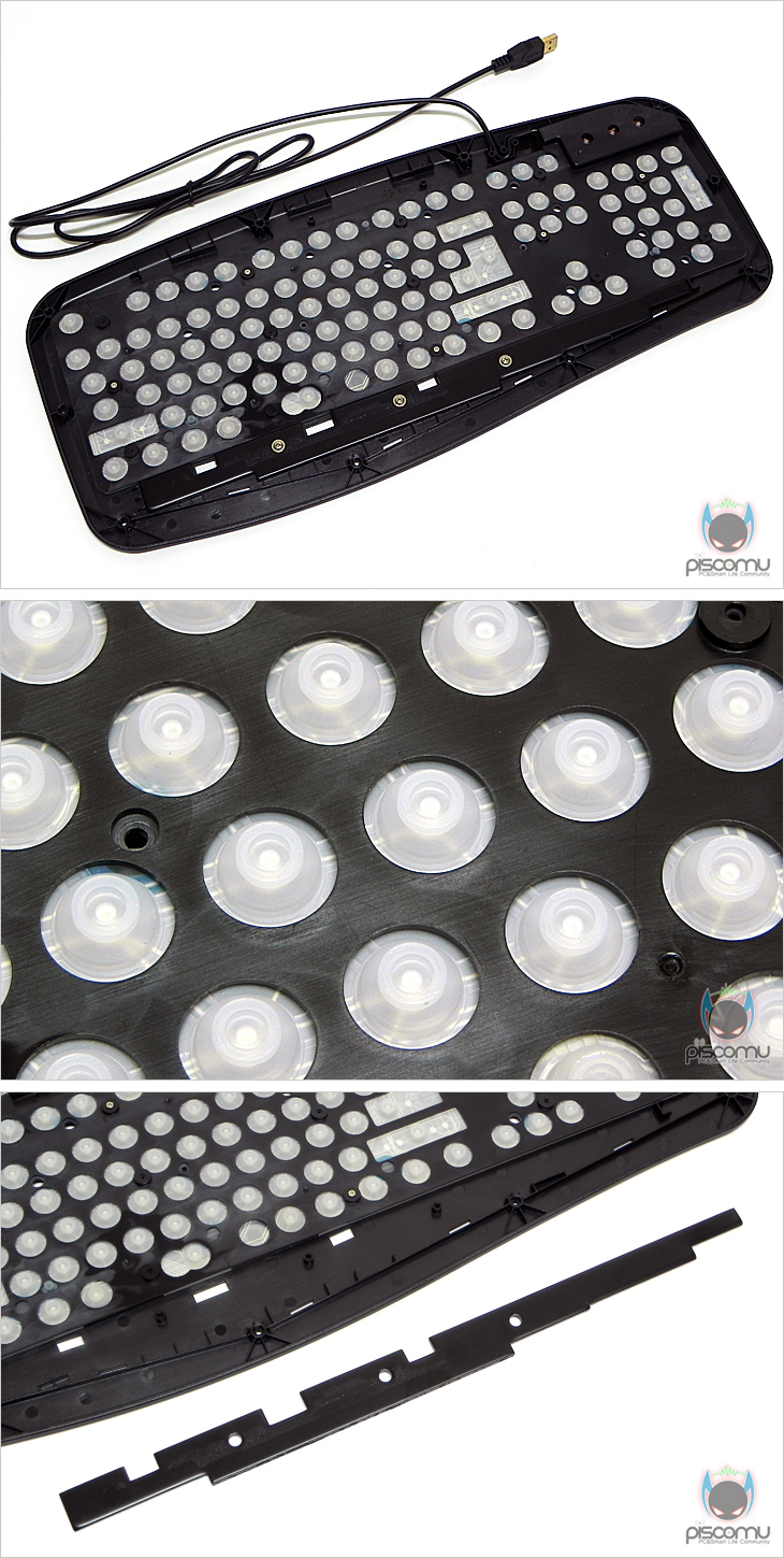 Force K3의 외형을 살펴보면, 전체 키 배열은 기본 구조를 가졌으며, 총 키 역시 106키 기본을 갖추고 있습니다. 엔터(Enter)키 역시 ┙형으로 기본 형태를 가지고 있어, 키 배열을 익히는 익숙할 것으로 생각됩니다. 조금 아쉽다면, 스페이스-바 길이가 조금 짧은 편이라는 점입니다. 키 캡을 살펴보면, 키 캡에 새겨진 영문 폰트가 크고 굵직해 쉽게 눈에 들어오며, 게임상에서 자주 사용되는 WASD키와 방향키는 별도의 블루색으로 처리되어 좀 더 위치인식을 빨리 할 수 있도록 했습니다. 키 입력방식은 대중적으로 가장 흔히 접하는 멤브레인 방식이 되겠습니다. 키보드 테두리 베젤부분은 크게 특징적인 부분은 없지만, 디자인부분에서 일종의 팜레스트 역할을 해줄 수 있게, 스페이스-바 아래 받침 길이를 길게 했으며, 표면처리도 조금 거칠게 처리해 땀 발생을 줄이도록 했습니다. 키보드 밑면을 살펴보겠습니다. 밑면에는 앞서 제품 특징에서 언급한 방수 기능이 있는데, 여기서 방수 기능이란, 물속에 제품을 담았을 때, 방수가 아니라, 음료수나 물을 순간적으로 쏟았을 시, 재빨리 불순물이 키보드를 빠져나가도록 해주는 기능입니다. 즉, 방수홀이 처리된 것입니다. 이 밖에 밑면 아랫부분에는 미끄럼방지를 위해 고무패드를 부착했으며, 앞부분에는 1단계 높이를 올릴 수 있는 높낮이 받침대가 지원되어 있겠습니다. 케이블 길이는 총 1.5m 유선으로써 충분한 길이를 가졌으며, 연결 인터페이스는 USB방식으로 포트 금속부분을 금도금 처리해 신호 손실을 최소화되도록 했습니다. 끝으로, Force K3를 분리해 내부를 살펴보면, 앞서 제품 특징에서 언급한 대형 러버돔과 내구성을 위한 내부 철재 보강판을 확인할 수 있겠습니다. 보강판은 스페이스-바 아래 베젤에 내장되어 있겠습니다.