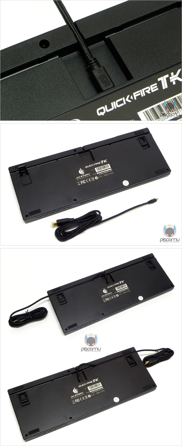 숫자키패드 경우엔 숫자와 방향키 모두 사용할 수 있게 지원하고 있는데, 키패드 위에 상태 LED를 통해, NUMLK(NumLock)키를 눌러서 활성화(LED On) 되었을 때는 일반 키보드와 동일하게 숫자키와/, *, -키가 인식을, 비활성화(LED Off)시에는 일부 숫자방향키(2/0/00/• 키)와 PRTSC(프린트/스크린), SCRLK(스크롤), PAUSE(멈춤)키가 인식이 되겠습니다. 또한, 숫자방향키 활성화시 자체적으로 키에 백라이트 On/Off로 통해 쉽게 구분이 되겠습니다. 키 캡에 새겨진 폰트 경우 한글은 전형적인 고딕체이며, 영문 폰트는 고딕체 계열의 디자인 폰트입니다. 그리고, 크기는 영문 폰트가 조금 더 큽니다. 접점 방식은 앞서 자사의 제품들과 마찬가지로 기계식이며, 스위치는 현재 가장 많이 사용되는 체리사의 MX스위치가 되겠습니다. 그리고, 스위치별로는 청축/적축/갈축 3가지로 출시되었으며, 축 윗부분에 LED가 배치된 것을 확인할 수 있는데, LED는 청축은 Blue LED, 적축은 Red LED, 갈축은 White LED로 적용이 되었습니다. 그리고, 내부 철재 보강판 역시 LED색상에 맞춰서 도색처리가 되어있겠습니다. 앞선 두 모델 트리거나 퀵-파이어 프로보다는 좀 더 스위치별로 디자인에 신경은 쓴 모습니다. 베젤 부분은 퀵-파이어 프로와 비슷하게 기본 높이가 조금 있으며, 숫자키패드 위치의 전면에는 브랜드 네임이 새겨져 있겠습니다. 측면에서 전체적인 키 라인 배열을 보면 계단식의 Step 형태임도 확인할 수 있겠습니다. 키보드 밑면에는 각 모서리 부근에 미끄럼 방지를 위해 고무패드를 기본 부착했으며, 앞부분에는 기본 높이보다 1단계 더 높일 수 있는 높낮이 받침대가 지원되었습니다. 높낮이 받침대 부분 역시 받침 부분은 고무재질로 처리했습니다. 그리고, 케이블 연결부는 앞선 자사의 두 모델과 마찬가지로 USB Micro B타입 방식으로 연결되어 있으며, 케이블 분리가 가능하겠습니다. 그리고, 제품 사용공간에 따라 케이블을 정리할 수 있게 케이블 정리 홈도 처리가 되어 있겠습니다. 끝으로, 분리되는 케이블 길이는 총 1.8m로 유선으로 충분하며, 케이블 전체는 패브릭 재질로 깔끔하게 슬리빙 처리 되었습니다. 그리고, 키보드와 연결되는 USB Micro B과 PC와 연결되는 USB 연결인터페이스 모두 신호손실 최소화를 위해 금도금으로 처리가 되어 있겠습니다.
