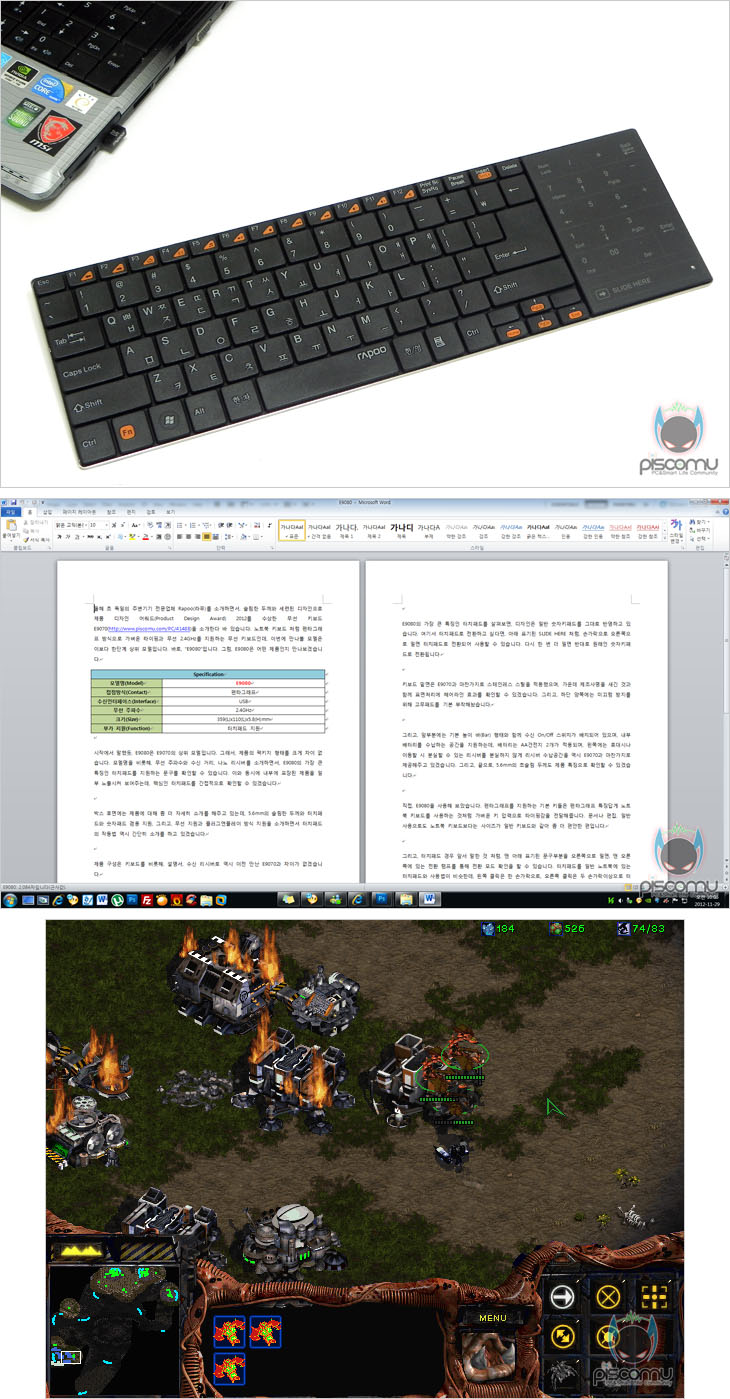 직접, E9080을 사용해 보았습니다. 키 타입이 노트북 키보드와 비슷하기 때문에 노트북 키보드를확장하는 사용느낌으로 노트북 위주에서 사용했습니다. 펜타그래프를 지원하는 기본 키들은 펜타그래프 특징답게 노트북 키보드를 사용하는 것처럼 가벼운 키 압력으로 타이핑감을 전달해줍니다. 문서나 편집, 일부 게임으로도 노트북 키보드보다는 사이즈가 일반 키보드와 같아 좀 더 편안한 편입니다. 그리고, 터치패드 경우 앞서 말한 것 처럼, 맨 아래 표기된 문구부분을 오른쪽으로 밀면, 맨 오른쪽에 있는 전환 램프를 통해 전환 모드 확인을 할 수 있습니다. 터치패드를 일반 노트북에 있는 터치패드와 사용법이 비슷한데, 왼쪽 클릭은 한 손가락으로, 오른쪽 클릭은 두 손가락이상으로 터치하면 되고, 스크롤은 손가락을 상하로 움직이면 되겠습니다. 노트북의 터치패드를 사용해 본 사용자라면 금방 익숙할 것으로 생각됩니다. 터치 반응은 즉각적으로 보여주는 편입니다.