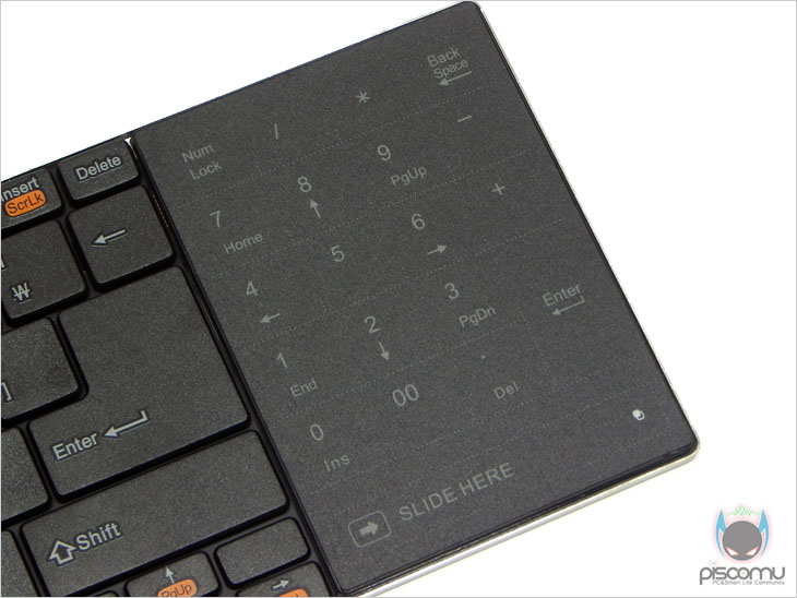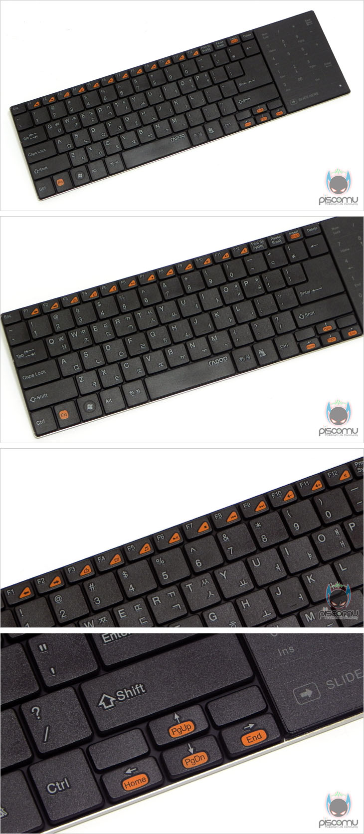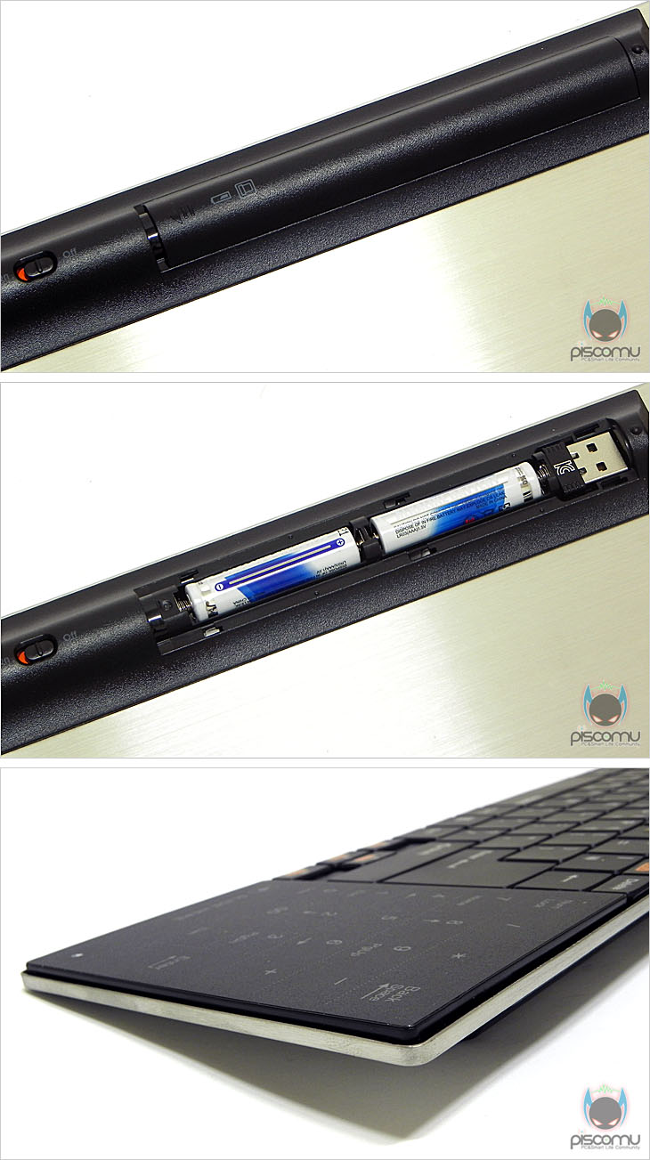 E9080을 살펴보면, 왼쪽에 배치된 터치패드를 제외하면, 나머지 전체적인 디자인은 E9070과 동일합니다. 펜타그래프 접점식을 가지 E9080은 키 배열은 기본 레이아웃 형식에 맞춰져 있습니다. 그리고, 왼쪽 Ctrl키 옆에 노트북 키보드처럼 Fn키를 지원하는데, Fn키를 통해서는 제일 상위에 있는 F1~F12키가 부가적으로 지원하는 멀티미디어 핫 키들을 사용할 수 있으며, 오른쪽 아래 있는 방향키에서는 페이지 단축키를 부가적으로 사용할 수 있겠습니다. E9080의 가장 큰 특징인 터치패드를 살펴보면, 디자인은 일반 숫자키패드를 그대로 반영하고 있습니다. 여기서 터치패드로 전환하고 싶다면, 아래 표기된 SLIDE HERE 처럼, 손가락으로 오른쪽으로 밀면 터치패드로 전환되어 사용할 수 있습니다. 다시 한 번 더 밀면 반대로 원래인 숫자키패드로 전환됩니다. 키보드 밑면은 E9070과 마찬가지로 스테인레스 스틸을 적용했으며, 가운데 제조사명을 새긴 것과 함께 표면처리에 헤어라인 효과를 확인할 수 있겠습니다. 그리고, 하단 양쪽에는 미끄럼 방지를 위해 고무패드를 기본 부착해놨습니다. 그리고, 앞부분에는 기본 높이 바(Bar) 형태와 함께 수신 On/Off 스위치가 배치되어 있으며, 내부 배터리를 수납하는 공간을 지원하는데, 배터리는 AA건전지 2개가 적용되며, 왼쪽에는 휴대시나 이동할 시 분실할 수 있는 리시버를 분실하지 않게 리시버 수납공간을 역시 E9070과 마찬가지로 제공해주고 있겠습니다. 그리고, 끝으로, 5.6mm의 초슬림 두께도 제품 특징으로 확인할 수 있겠습니다.